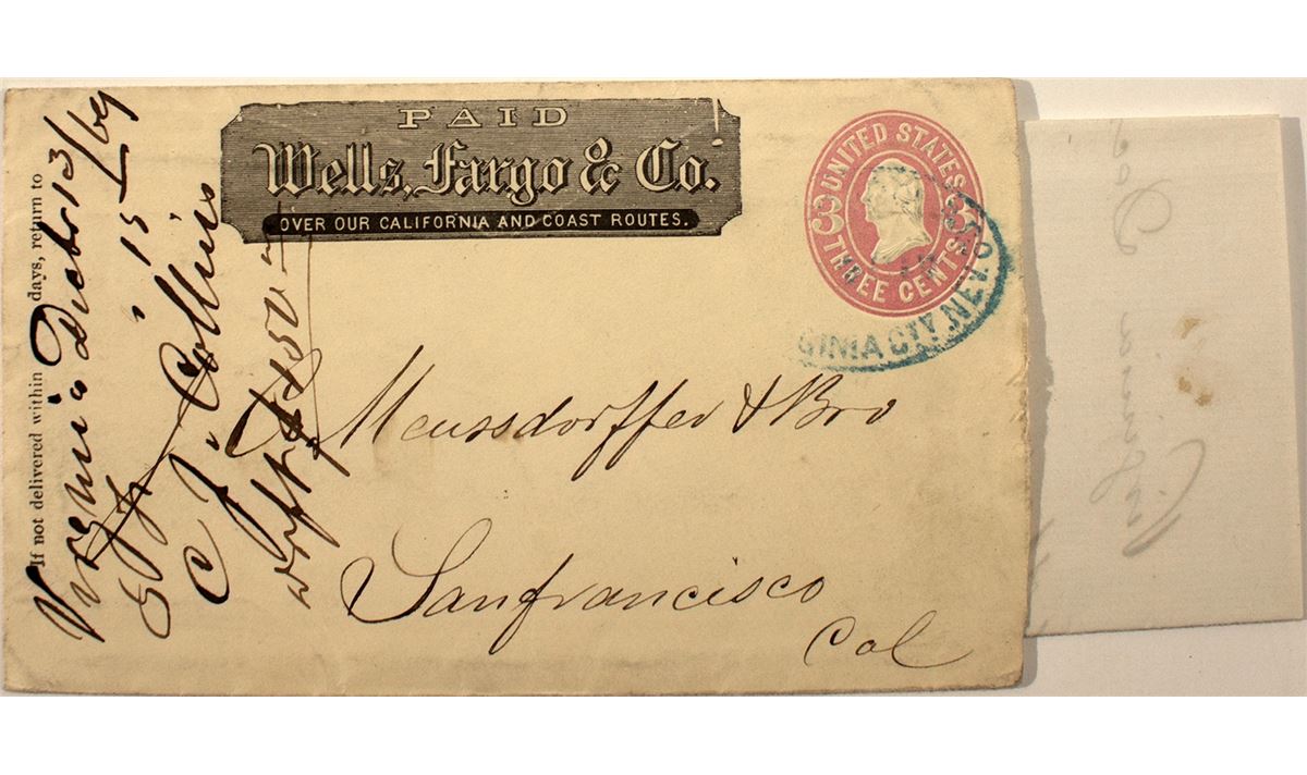 Wells Fargo franked cover and letter addressed to Meusdorffer & Bro in San Francisco December 13, 1869.