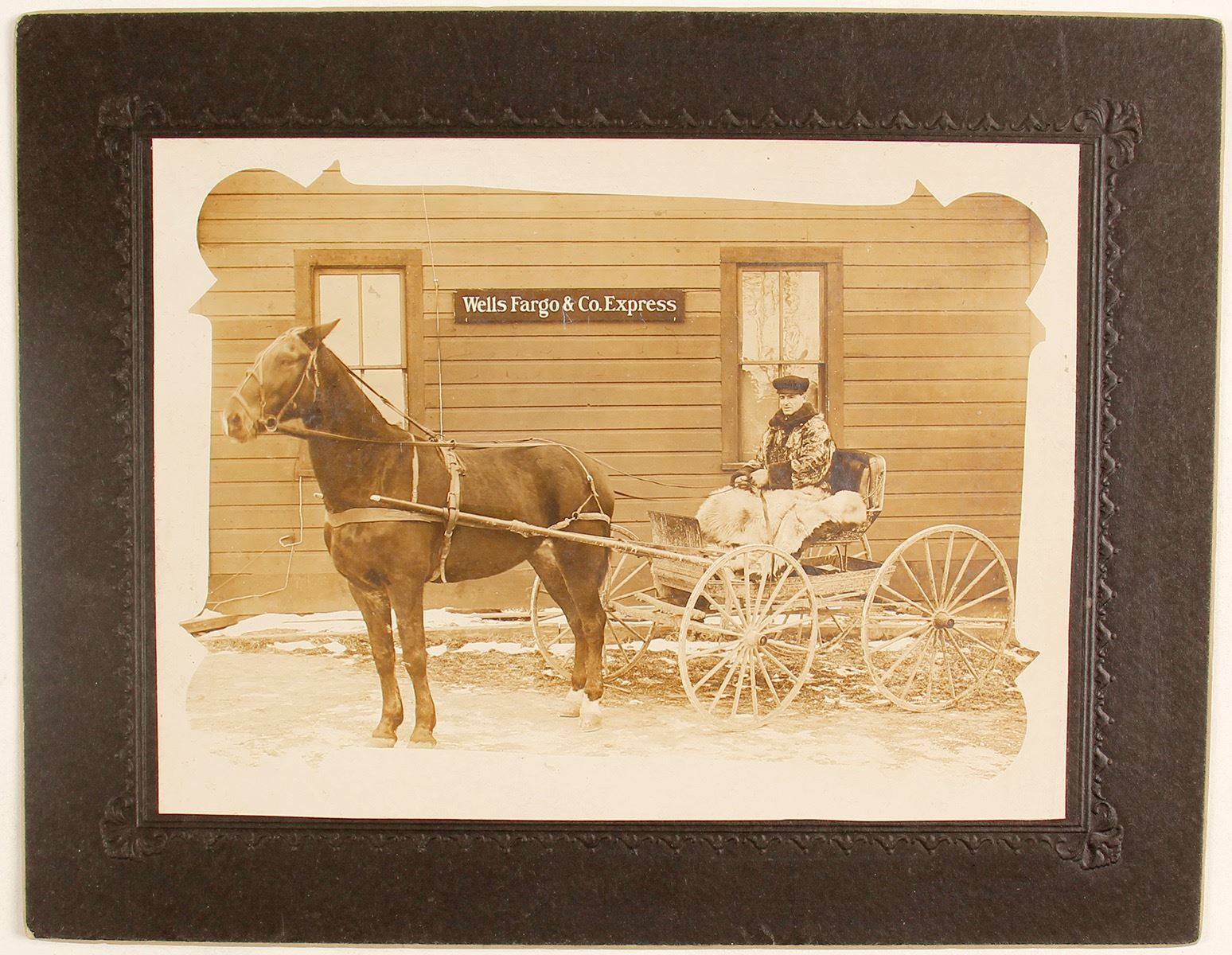 Very nice photo of a warmly dressed man in a buggy outside the express office. Although there is no identification as to where, the man's jacket and fleece(?) blanket seems to assure us that it is in a part of the county that is extremely cold. Photo is 5 x 7". Mount is 7 x 9". Very nice contrast. Sharp and clear. You can even see the wrinkles in the man's face. Date: Location: HWAC# 62257