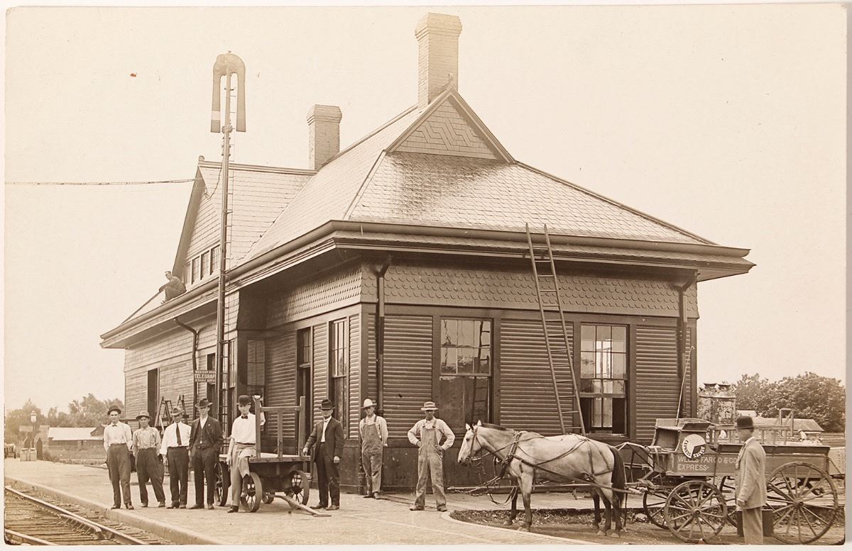 Pristine photo Postcard of eight men and a horse drawn Wells Fargo & Co. Express wagon standing in front of a Western Union telegraph and cable office located in trackside train station. City: State: Date: ID# 44834