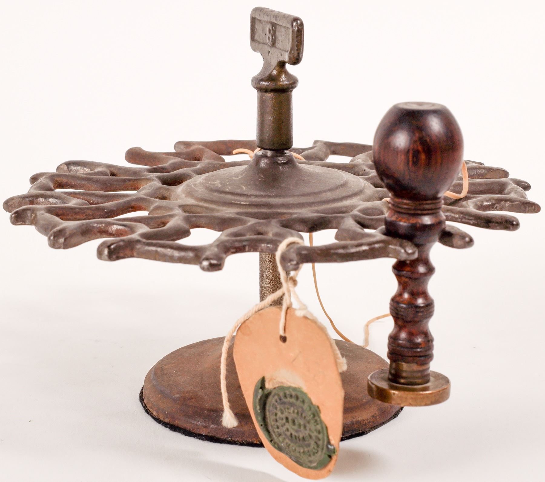 WELLS FARGO & COMPANY/ATLANTIC/1885/DEPARTMENT/EXPRESS. brass receiving hand stamp with wood handle. Approx. 7/8" diameter x 4" length. Comes with antique wrought iron carousel-style stamp holder commonly used in postal offices. Tied to the carousel is a cardboard tab with a green wax impression of the stamp. According to the Catalogue of Wells, Fargo & Company Historical Exhibit, Etc. at the Worlds Fair Columbian Exposition, Chicago, Illinois 1893 and 1929, exhibit # 31 describes a photograph relative to this wax seal / hand stamp. "Photo of Wells, Fargo & Co.s Depot, Jersey City, (opposite New York) This building affords facilities for simultaneously loading and discharging two express trains each way and maneuvering forty-two wagons-double and single teams. The supply station of the Atlantic Department is located on the second floor of this building"