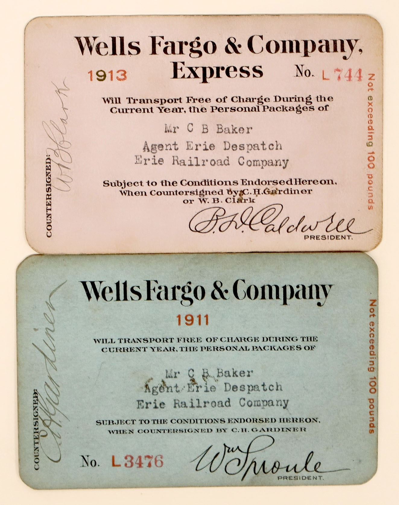 Wells Fargo & Co free package transport Passes #L744 and L 3476 for Mr. C B Baker Agent Erie Railroad. In protective sleeves and exc. conf.