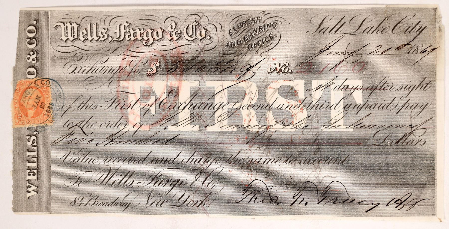 Wells, Fargo & Co. Exchange Note, First of Exchange # 2160, issued to Pomeroy & Co. for $500 on Jan 20, 1869 in Salt Lake City, UT. Signed by Wells, Fargo & Co. agent Theodore F. Tracy. US orange, adhesive 2c IR stamp at left, with clear W.F. & Co Salt Lake City printed cancellation. Red rubber stamp by the Fourth National Bank "Paid", with signatures from "Pomeroy & Co. in liquidation", W. Bapett, Jr.(?) and A. Laneal(?). Chipped upper left, incl. stamp, but otherwise very fine in appearance. This is a rare First Exchange Note out of Utah! Franklin Collection. Salt Lake City Utah Franklin Collection