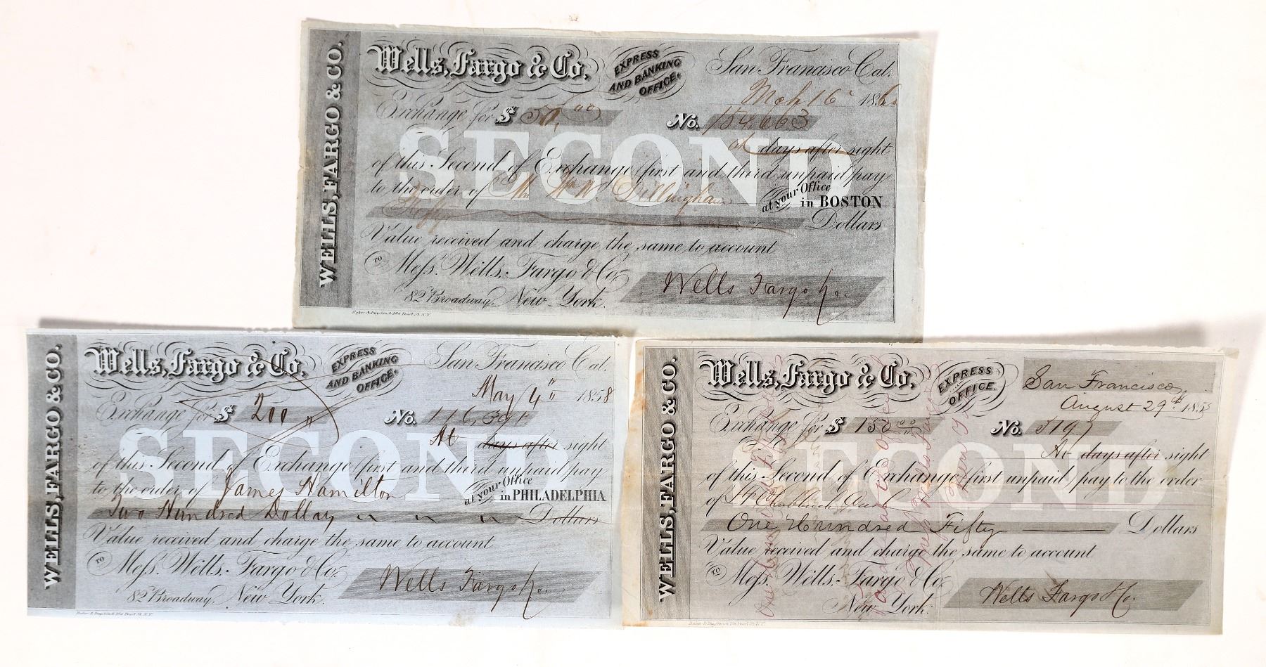 3x Wells, Fargo & Co. San Francisco Exchange Notes out of 3 different Offices (NV, MA, PA), Second of Exchanges: 1) #3197 issued to L.J. Chibbuck(?), cashier for $150 on Aug 29, 1855 in the San Francisco office. Signed on reverse by Chibbuck, payed to the order of Oscar Maltman. 2) #116391 issued to James Hamilton for $200 on May 4, 1858 in the Philadelphia Office. 3) #154663 issued to Dillingham for $50 on Mar 16, 1860(?) in the Boston office. Very interesting to see the same San Francisco exchange vouchers used in different locations in the US. Franklin Collection. Columbia California Franklin Collection