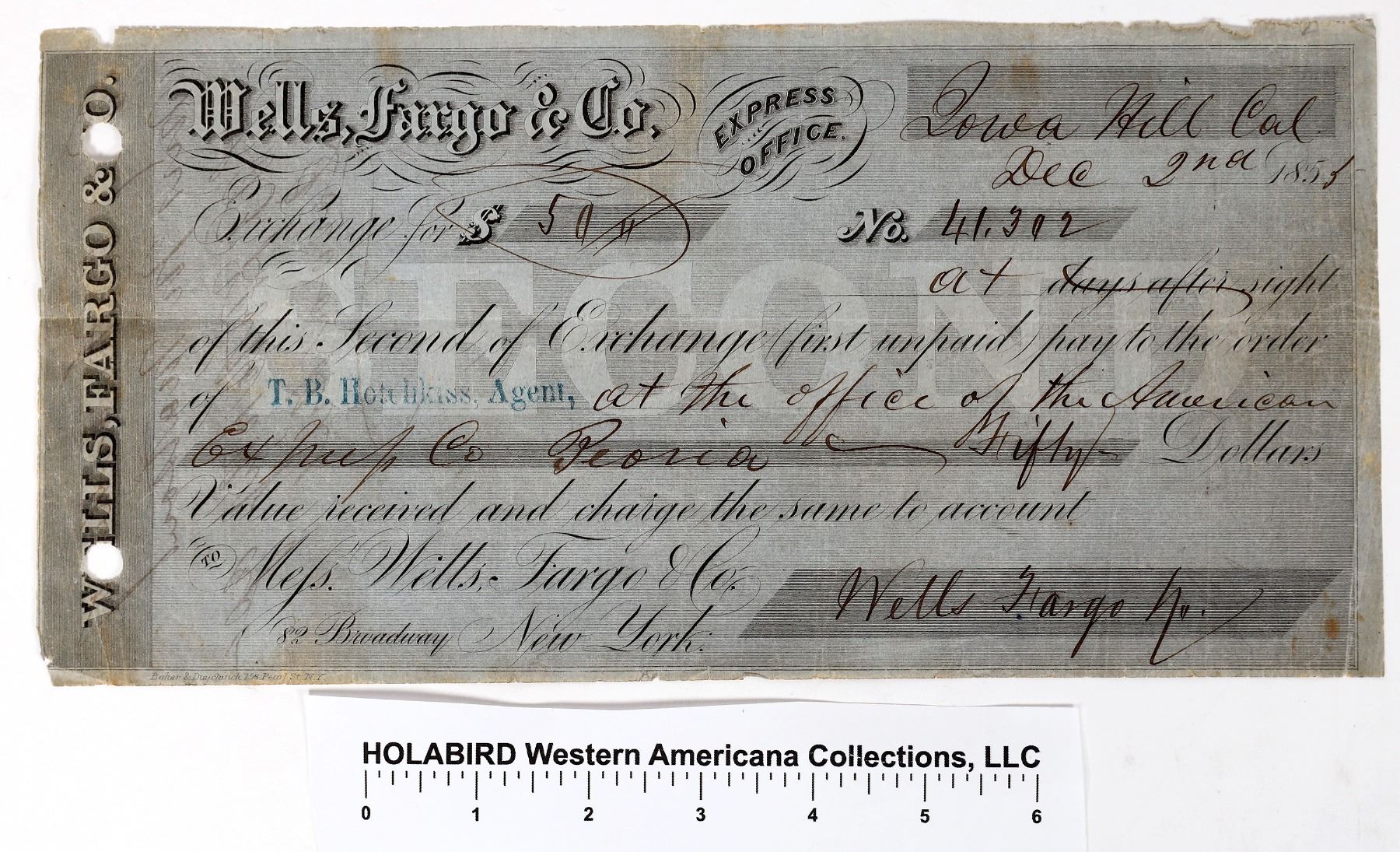 Wells, Fargo & Co. Second of Exchange, Iowa Hill, Gold Rush Era 1855 [155337]