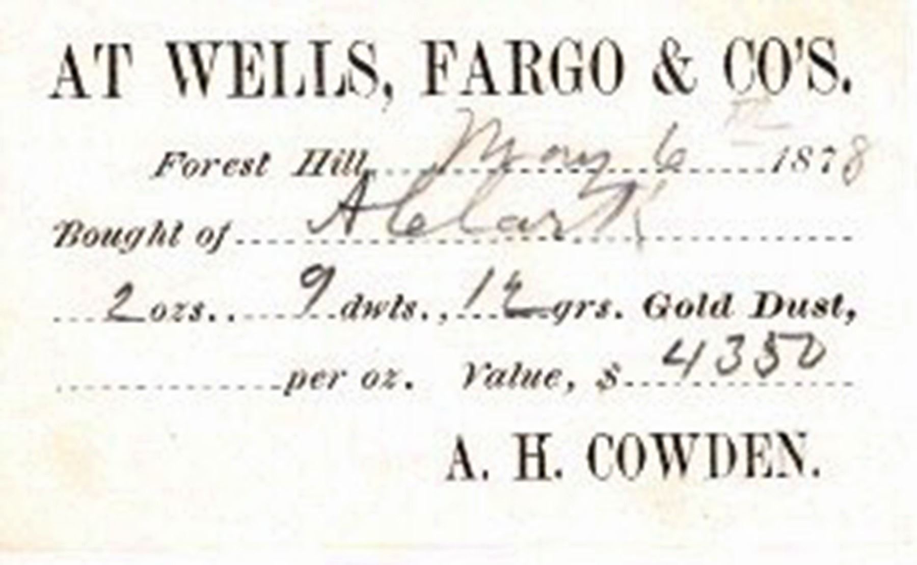 Forest Hill, CA, 1878 - Wells Fargo & Co. Gold Dust Purchase Card - Very rare gold dust purchased card where the Wells Fargo office at Forest Hill bought from A. Clark 2 ounces 9 dwts of gold dust worth $43.50. A. H. Cowden was the Wells Fargo agent. Extremely Fine. Size: 3.625 x 2.25 inches. Forest Hill California Franklin Collection