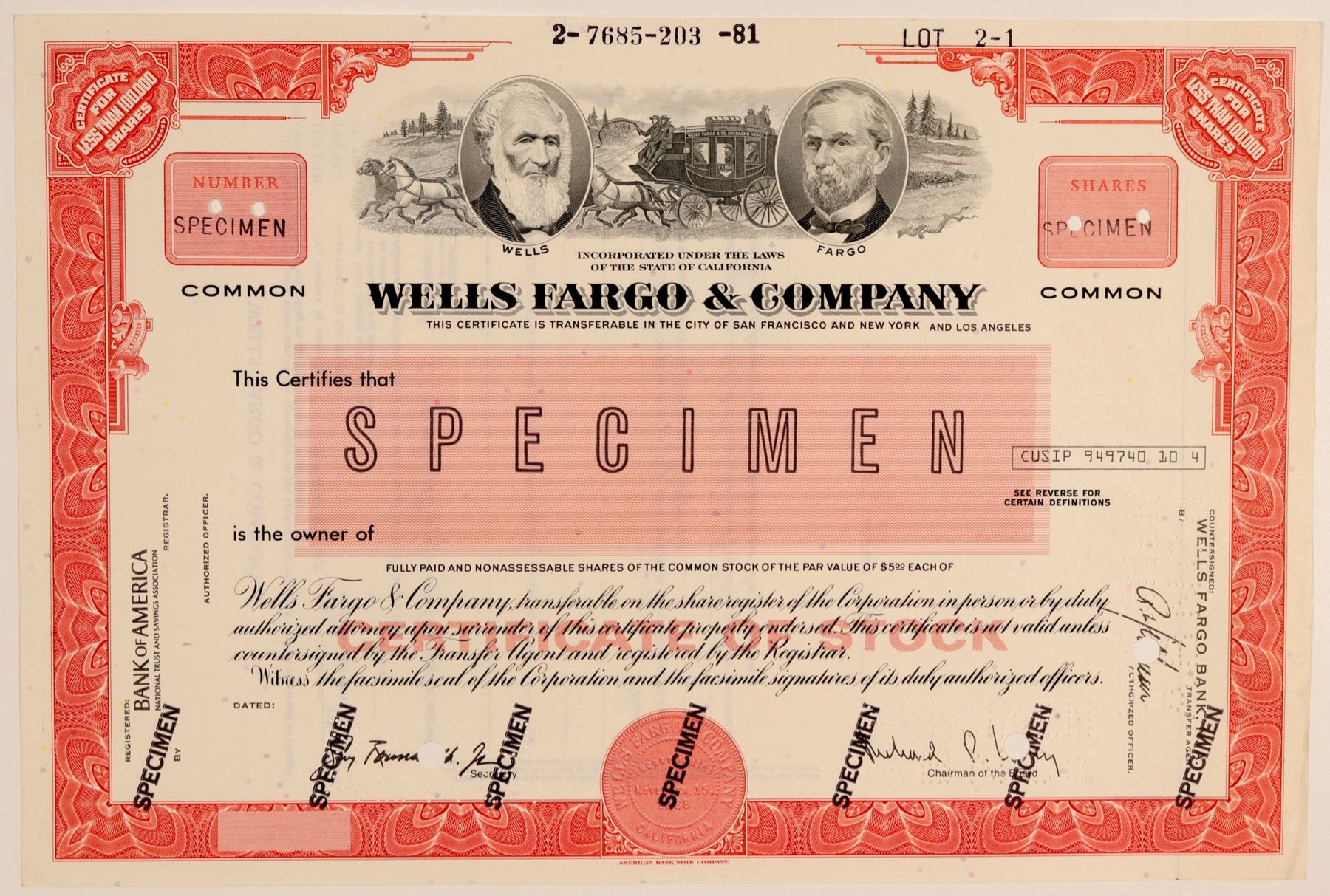 Wells Fargo stocks come and go, but this is a beaut! Red, pink and black on white. Vignette of Wells and Fargo in front of a self-described Wells Fargo & Company Stage. Specimen is mentioned throughout the stock in type and hole punches. American Bank Note Company. We did not remove it from its well protecting cover, but seems to have no issues. (Be sure to see the Adams Express company Specimen stock for a nice pairing.) City: State: California Date: