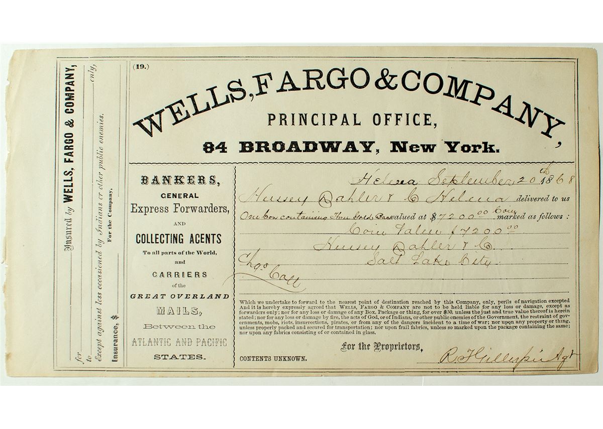 Great gold rush receipt to Hussey Dahler & Co. for one box containing three gold bars at $7200. Hussey Dahler operated banks in Helena and Virginia City, Montana Territory, with another branch in Salt Lake City, Utah Territory. Charles L. Dahler and Warren Hussey opened their banking firm in 1866. Dahler was also County Commissioner for Virginia City for 12 years.