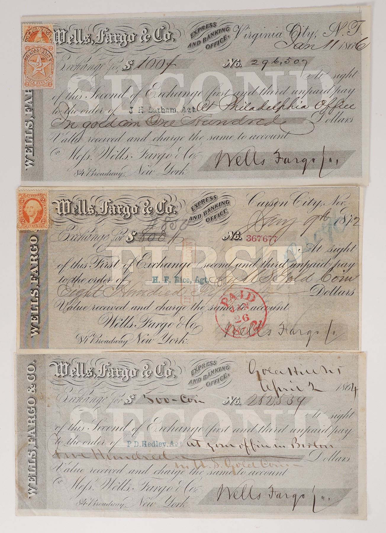 3 Wells Fargo checks from the Comstock Vicinity. Very rare 1872 datelined Carson City, First of Exchange, issued to H F Rice, Wells Fargo agent in Carson City. 2c adhesive revenue stamp. 2 red rubber seals. Very fine condition. Very rare and possibly unique 1866 Second of Exchange, datelined Virginia City, issued to J H Lathom agent at Philadelphia. Federal and Nevada 2c adhesives with W F & Co., Virginia City cancels. Very fine. 1864 datelined Gold Hill, issued to P D Hedley, agent in Boston. No stamps. Virginia City Nevada Franklin Collection