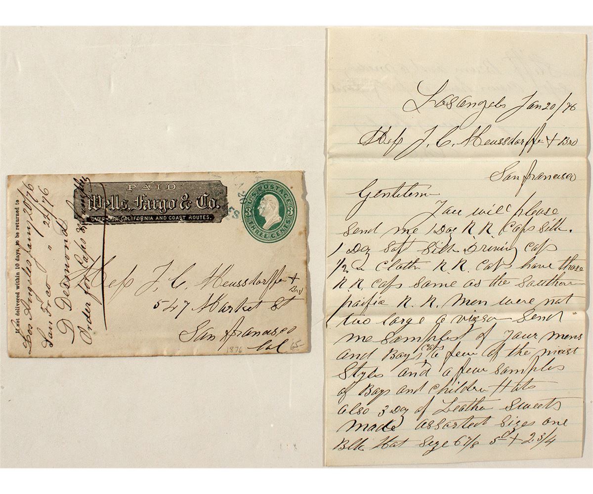 Letter datelined Los Angeles, Jan. 20, 1876. Addressed to J.C. Meussdorffer & Bro. in San Francisco. D. Desmond is ordering RR silk caps. 7.75" x 5" According to the 1876 SF directory, Meussdorffer were importers and jobbers of hats, caps, and hatter's material at 547 and 549 market St. Cover also in good condition. Cover has green printed three cents. (Prag Collection)