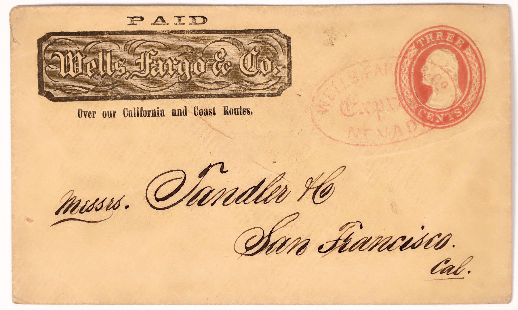 Nevada, California red oval Wells Fargo with Old English "Express" cancel on 3 cent red on buff pre stamped envelope, Sc U10, with boxed printed frank "Paid Wells, Fargo & Co. Over our California and Coast Routes" addressed to San Francisco.