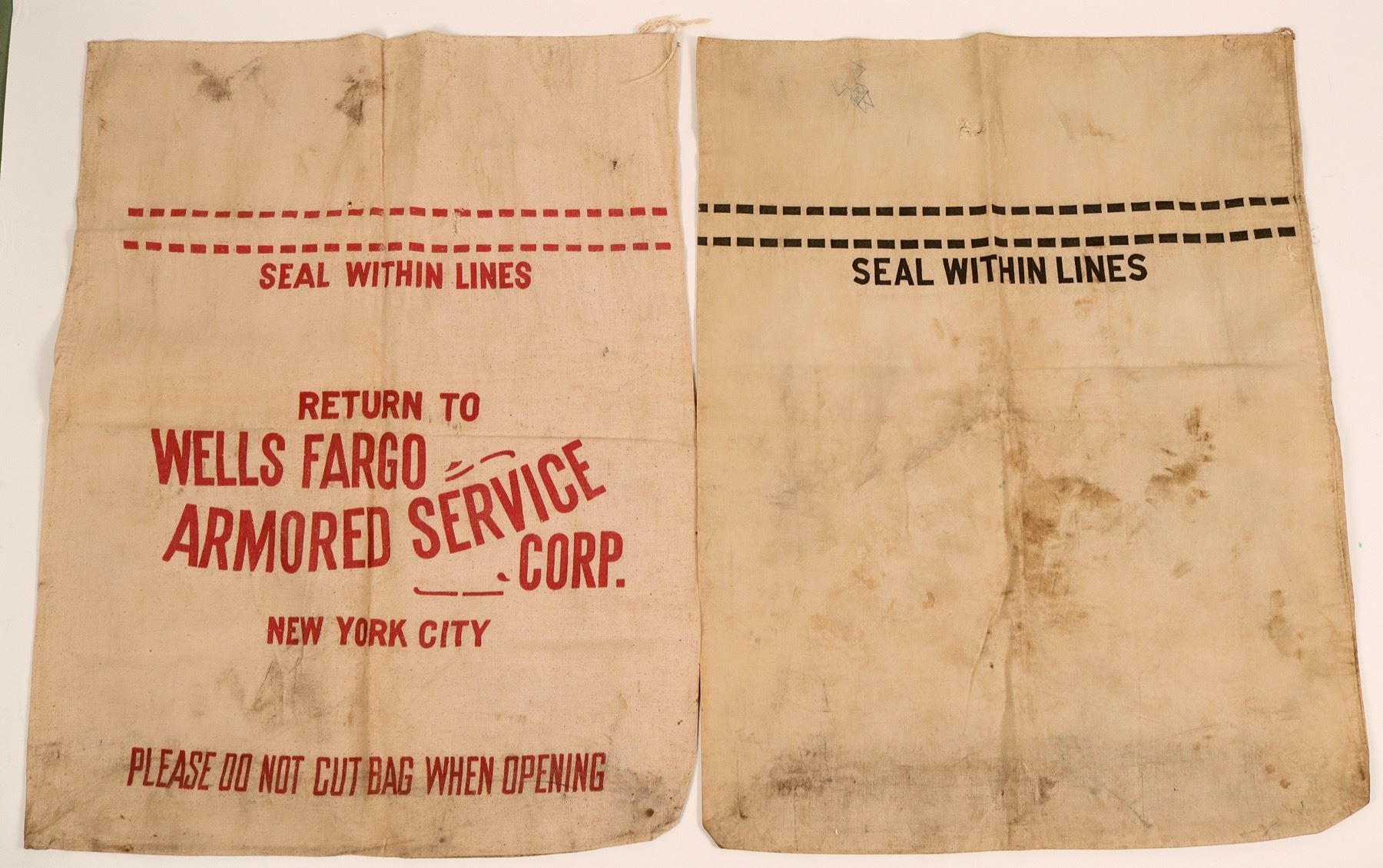 A pair of Wells Fargo canvas currency bags from New York City. Bags measure 28"x 22" and are made of a muslin/canvas material. These are a rare find.