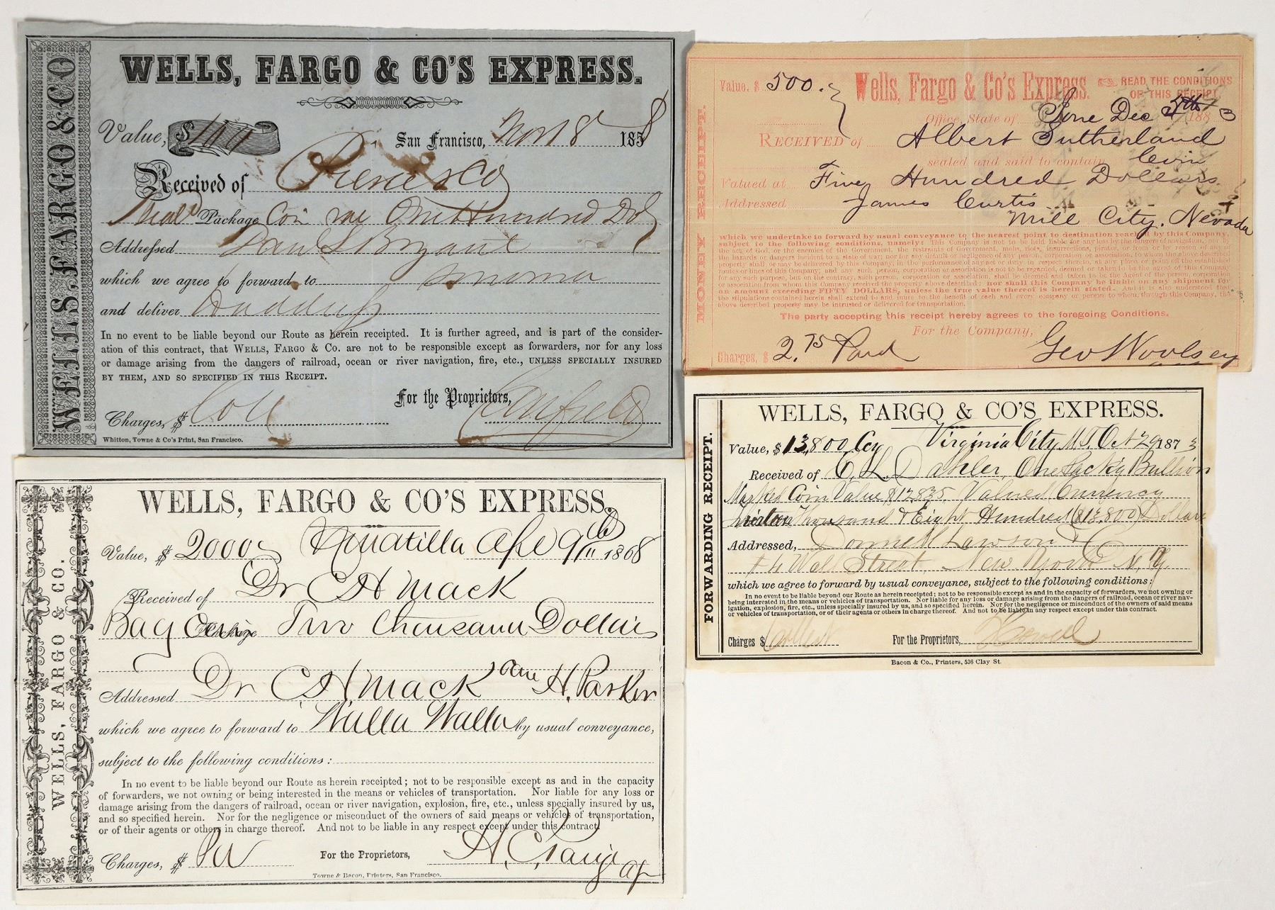 Lot of 4 different. 1) 1883 receipt for shipment of $500 coin from Ione to Mill City, Nevada. 2) 1873 Virginia City, Montana Territory receipt for bullion package to CL Dahler worth over $12,00 in coin and $13,000 currency. Sent to NY. 3) 1858 receipt from San Francisco for $100 in coin to Sonoma. 4) 1868 Umatilla, Oregon receipt for $2,000 in coin sent to Walla Walla.