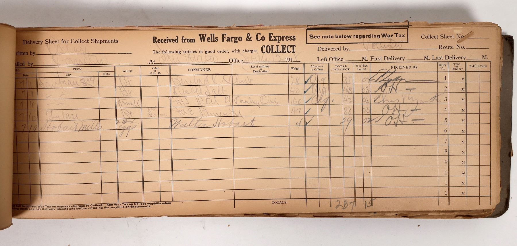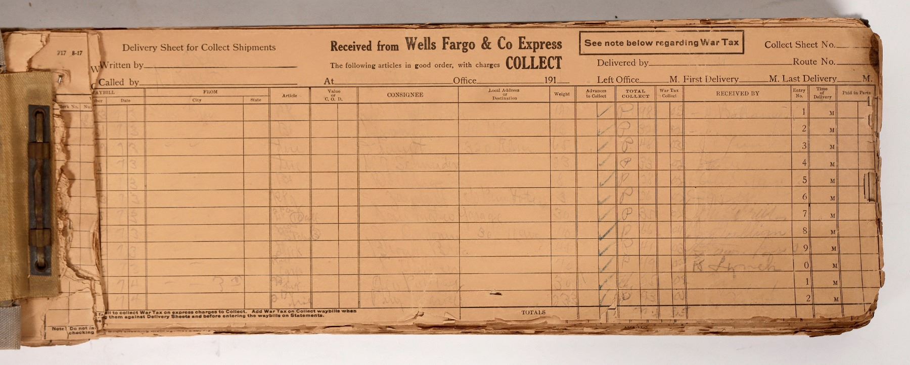 Wells Fargo Express Collect Shipment Book, 1918 for the San Mateo office. 7 x 17" bound by folding metal clip at left edge. "acid" paper. generally very good condition. This book was used for collect packages shipped via Wells Fargo Express and received at the San Mateo office. The signature of the receiving party is at right. Maybe 200 pieces +/-.
