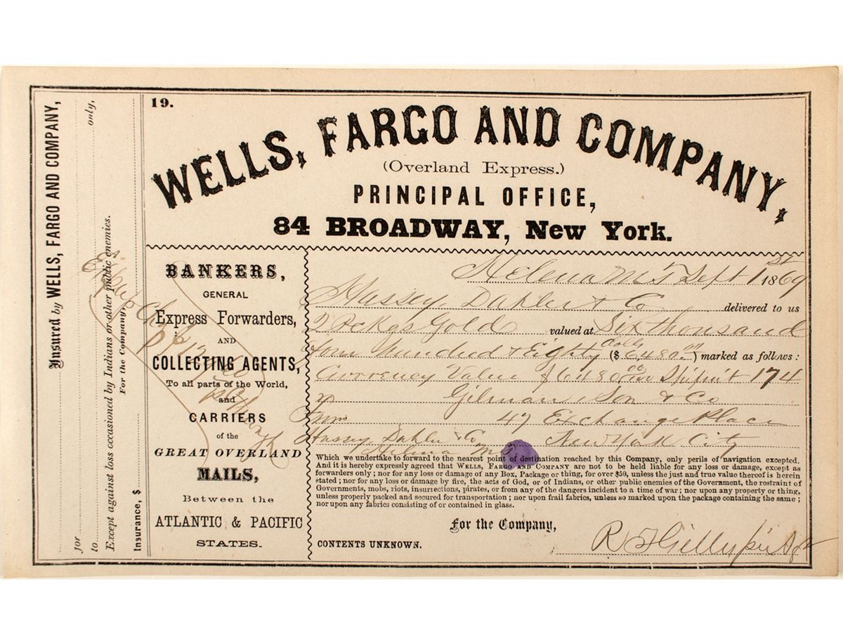 Receipt from Wells, Fargo and Company's 84 Broadway, New York office for 2 packages of gold worth $6480 from Helena, MT to New York City. They could have used the gold scale in this auction that also came out of Montana!