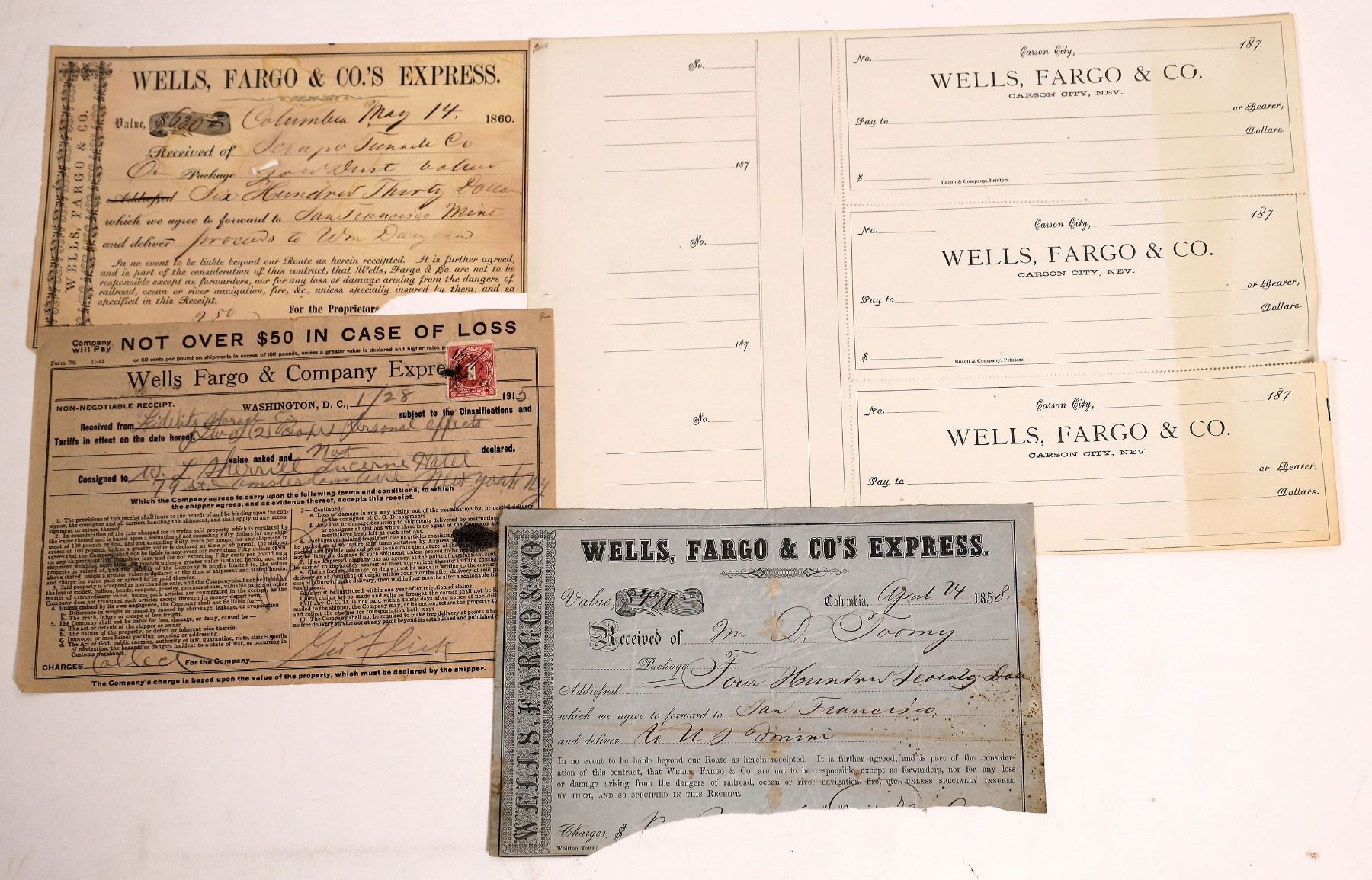 Group of about 18 pieces of Wells Fargo ephemera including mostly checks and forwarding receipts. There is one rare forwarding receipt from Columbia, California for a shipment of gold dust to San Francisco dated May 14, 1860. Columbia was one of the most important towns on the "Mother Lode" in the early Gold Rush era. the signature portion of this receipt is torn off, which indicates that the delivery was completed. The Wells Fargo checks are from Folsom, San Francisco, Columbia, and Carson City. Checks are about 7.75 x 3 and receipts are about 8.25 x 5.25. Good condition except two receipts have the signature portion torn off. State: City: Date: c1860s-1910s Provenance: