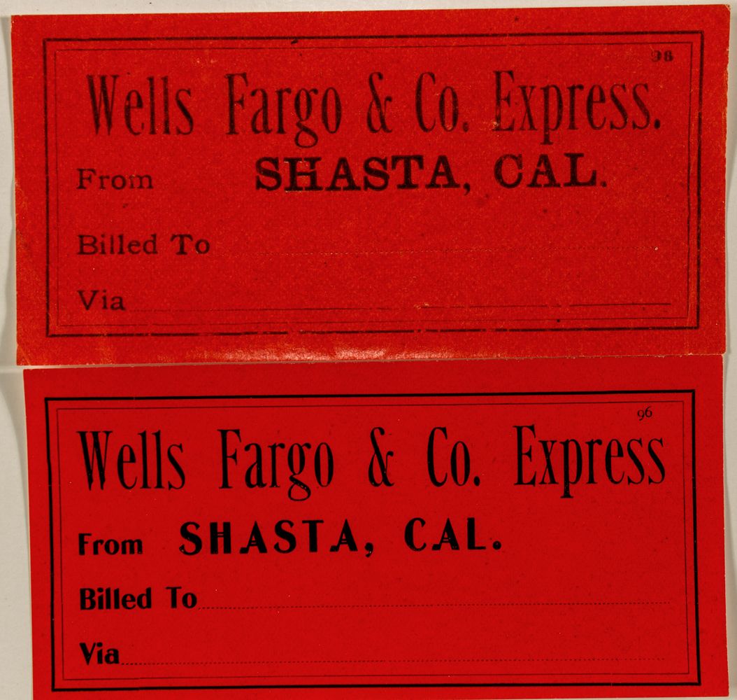 Two labels for packages from the Gold Rush town of Shasta, California.