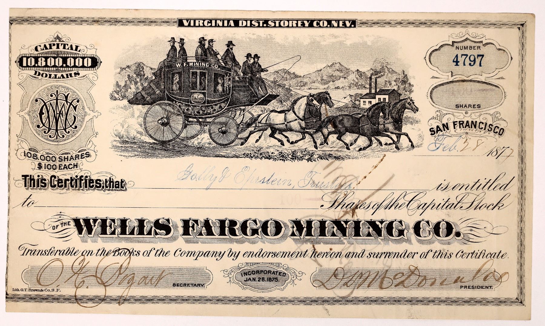 Wells Fargo Mining Company - Virginia District, Storey County, Nevada Stock Certificate No. 4797 for 100 shares made out to Golley & Epstein, Trustees (stockbrokers in S.F.) dated Feb. 28th, 1877. "This is one of the oldest locations in the mining section known as the North Virginia. It is situated a little less than a mile in a direct line and Eastward from the original locations on the Comstock. Formations similar to those on the Comstock are plainly traced across the dividing canon and are found in North Virginia. The situation of the Wells Fargo is directly east of the Utah, Sierra, etc. A shaft has been sunk that cut through a large ledge of promising vein matter, from which liberal assays have been made. Hoisting works have been erected, with machinery sufficient to conduct operations1200 feet, at least. No. of feet, 1500; No. of assessments, 11. Amount, 50c per share. Levied September 11, 1878. Total assessments $226,800." Reference: Pacific Coast Annual Mining Review and Stock Ledger October 1878, p. 256. Officers at this time were D. M. Seaton, president and W.M. Hellman, secretary. The Company was capitalized at $10,800,000; 108,000 shares at $100 each and incorporated in San Francisco, on January 28th, 1875. Signatures on this earlier certificate include O. (Olander) H. Bogart, Secretary and D. L. McDonald, President. Wonderful large vignette of a stagecoach showing details of six riders and driver on top, passengers inside and drawn by four horses past a smelter. The name "W. F. Mining Co." is labeled on the coach in the vignette. As of September 11th, 1878, eleven assessments had been levied for a total of $226.800. Black on white paper. Printed by Lith. G.T. Brown & Co., S.F. Grafton Tyler Brown (1841-1918) also painted landscapes of Yosemite Valley, San Francisco, and many of the "City Views" that C.C. Kuchel was noted for. He is listed with his partner W.T. Galloway in Bishop's 1876 S.F. Directory p.223. Brown was the first African American Lithographer in the West and became California's first black sketch artist. He worked first for the lithography firm of Kuchel and Dresel Company, whose specialty was views of California mining towns and mining genre. See below. Fine condition. Very scarce a few examples known. Paid $3000, Value $4000. Reference: Company is listed in Becker's Geology of the Comstock Lode and Washoe District 1882 on p. 412. also see Statistics of Mines and Mining in States and Territories West of the Rocky Mountains Eighth Annual Report of Rossiter W. Raymond 1877 (for the year ending April 13th, 1876); p. 467; San Francisco City Directory by D. M. Bishop 1876, p.194 (O.H. Bogart ref.); p.424 (Golley & Epstein: address for Emanual Epstien ); p.511 (address for Leon Golley and firm: Stock Brokers at 308 Sansome); p.1383 (G. T. Brown & Co. Lithographers, 540 Clay); p. 1401 (Wells Fargo Mining - S.F. Office at 328 Montgomery). Also, McKenney's Business Directory for 1878 p. p. 671 (for Golly & Epstein, Stock Brokers at 417 California St.). The Alexandra Tillson Filer Collection, item 689, p. 118. Grafton Tyler Brown (1841-1918) also painted landscapes of Yosemite Valley, San Francisco, and other California locales. He is listed with his partner W.T. Galloway in Bishop's 1876 S.F. Directory p.223. Brown was the first African American Lithographer. Brown is considered the first professional African American artist and lithographer in California. "Born of free ancestry in Pennsylvania, Brown His family were freed slaves who moved from Maryland in 1837 and arrived in San Francisco from Pennsylvania in the early 1860s. He was able to find work as a lithographer in San Francisco at the firm of Kuchel and Dresel Company where he specialized in "bird's-eye" city views. He bought the business in 1866, renaming it G.T. Brown & Co. (See Henry G. Langley's San Francisco Business Directory for 1866 which locates G.T. Brown at 543 Cla, p.512; previous directories list this address for C.C. Kuchel). His early creations consisted of illustrating and documenting the settlements, gold-rush towns, and ranches that were springing up in the territories surrounding San Francisco. This served as part of the commercialization of the developing nation. Although his business as a commercial draftsman was successful, Brown sold it in 1879 and in 1882 left the Bay Area for Canada, where many Blacks found a more racially tolerant environment. Brown turned to paint as his primary medium and began to focus on the beauty of the Canadian landscape. By 1885 the Pacific Northwest and its mountainous landscapes inspired him to paint his most noteworthy pieces. Brown's soft palette fills his nature-drenched vistas with awe-inspiring majesty. This was a quality that characterized his grand landscapes. Brown frequently included railroad tracks and ferryboats in his landscapes, which serve as subtle but poignant reminders of the encroachment of civilization." Reference: San Francisco Lithographer- African American Artist Grafton Tyler Brown by Robert J. Chandler, 2014. Also, The St. James Guide to Black Artists, Edited by Thomas Riggs; 1997, St. James Press, Detroit, MI Virginia City Nevada Franklin Collection
