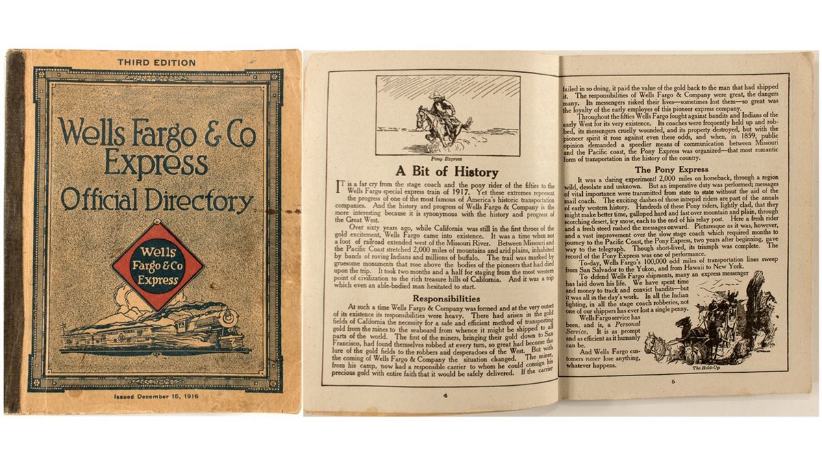 304 page directory of Wells Fargo & Co. Express offices and employees in 1916. 5 1/2 x 7". Very good condition, rare.