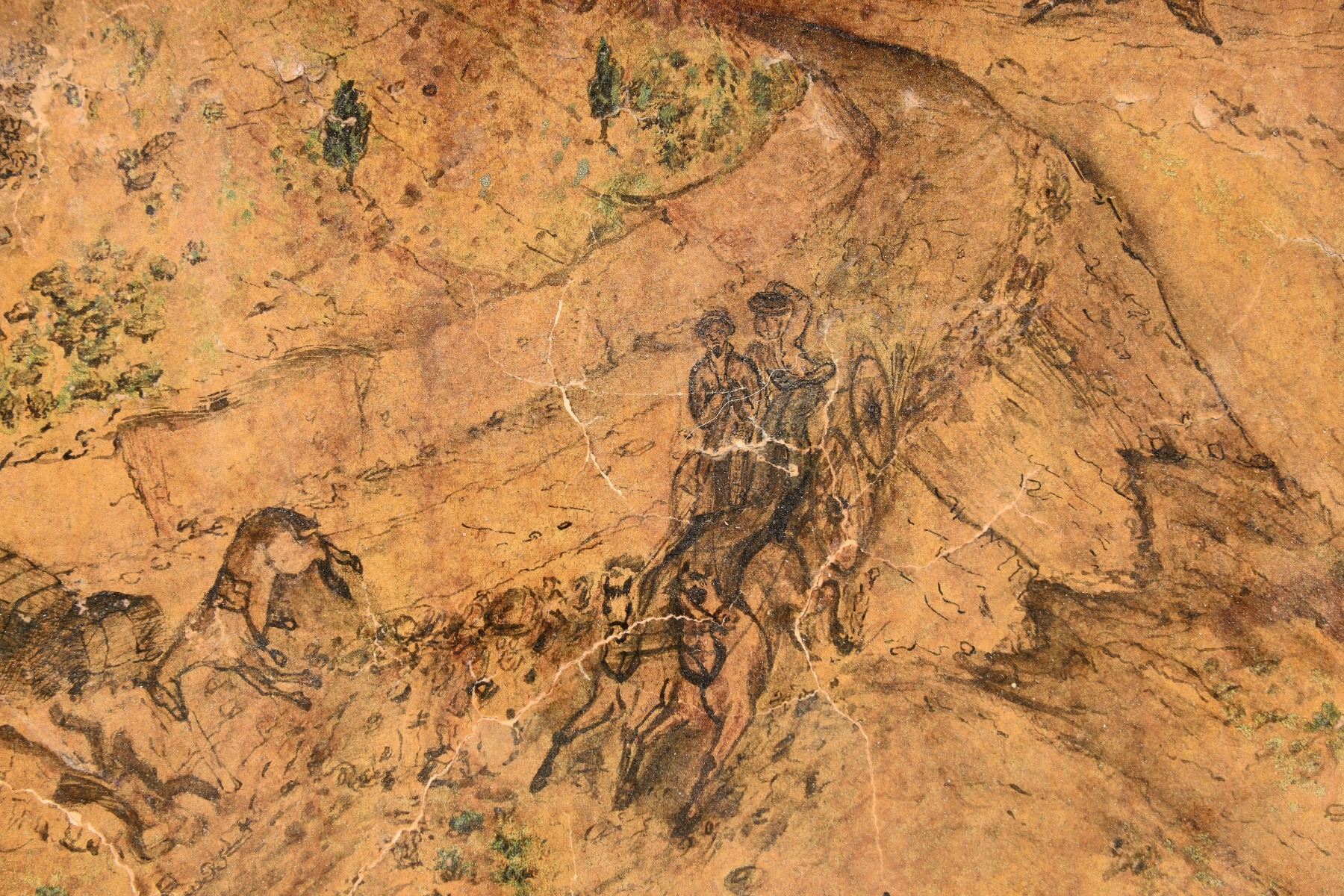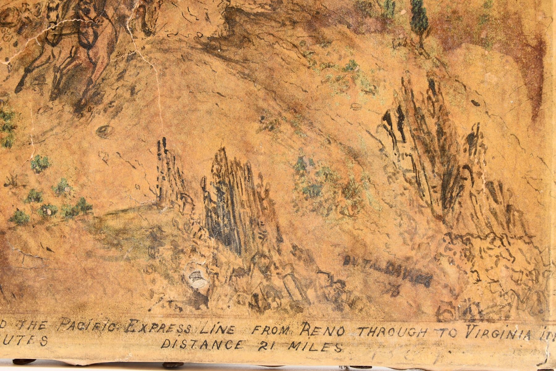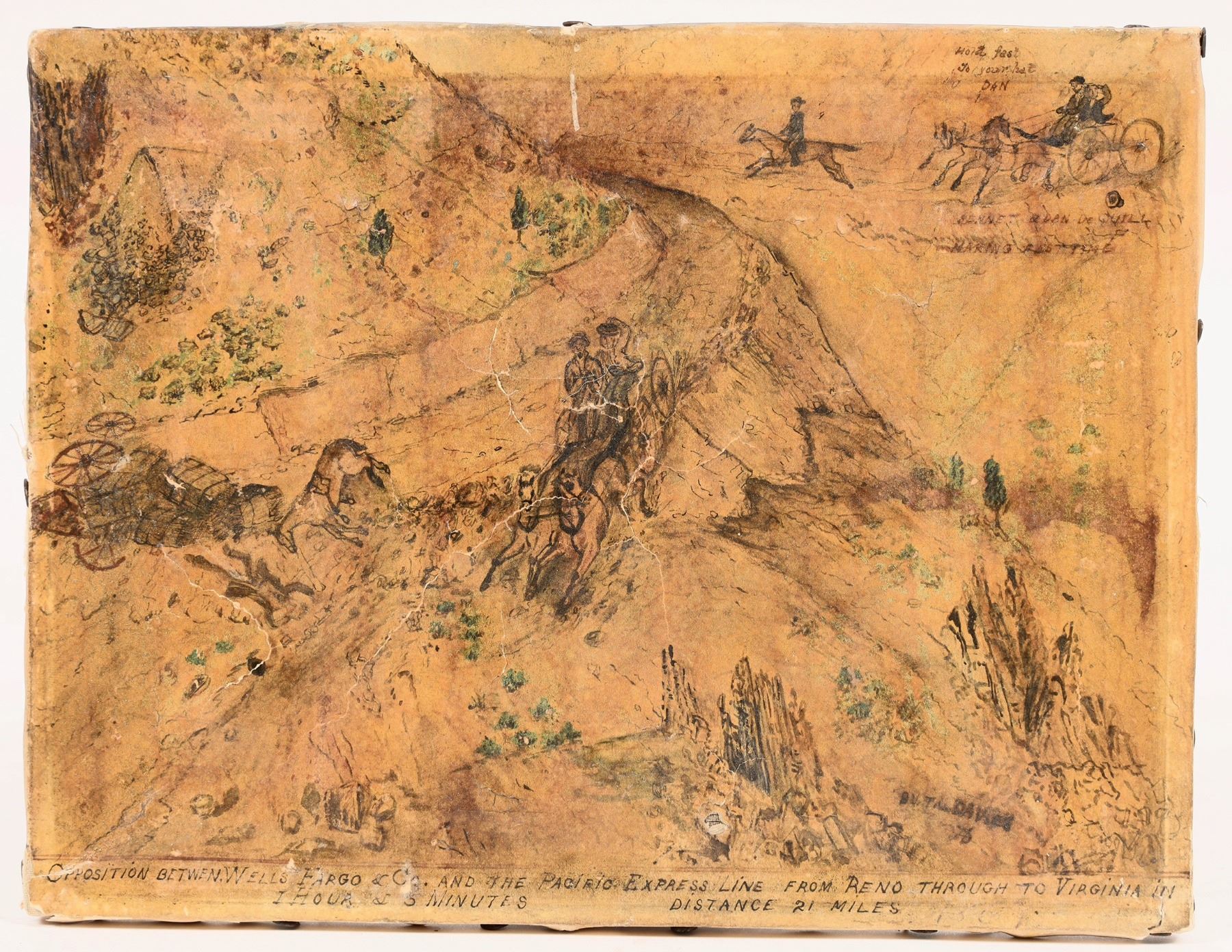 At the top right: "Hold Fast/ to your hat/ Dan / Bennett and Dequille making fast (illegible). Along the bottom edge is: "Opposition between Wells Fargo & Co. and the Pacific Express line from Reno through to Virginia City. 1 hour 5 minutes, distance 21 miles." 10.5 x 8.25", ink on canvas. Cracked, discolored from nicotine smoke. In need of restoration.