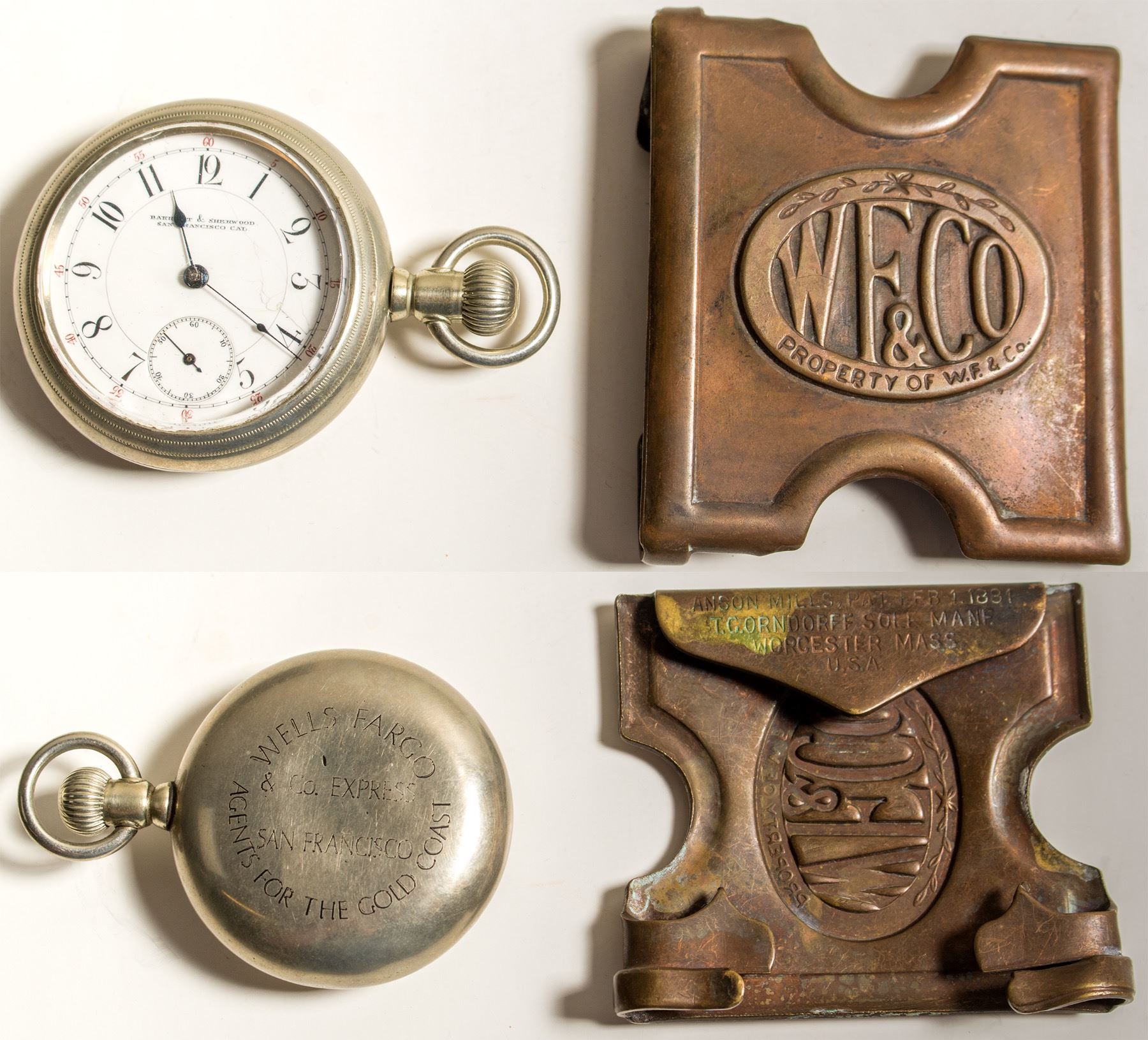 The belt buckle is an Anson Mills piece stamped WF & Co with the face in good condition. The pocket watch is a Rockford Watch Co. mechanism manufactured in 1882, the face is a Barrett and Sherwood and it is set in a nickel case. The Rockford Watch Co. is known for their reputability in railroad watches. The back of the case is inscribed "Wells Fargo & Co. Express San Francisco Agents For The Gold Coast". Quality piece built for functionality and reliability for Wells Fargo. Watch is serial number 181284, size 18s, full plate. (See https://pocketwatchdatabase.com/search/result/rockford/181284) State: City: HWAC#: 38538 Date:
