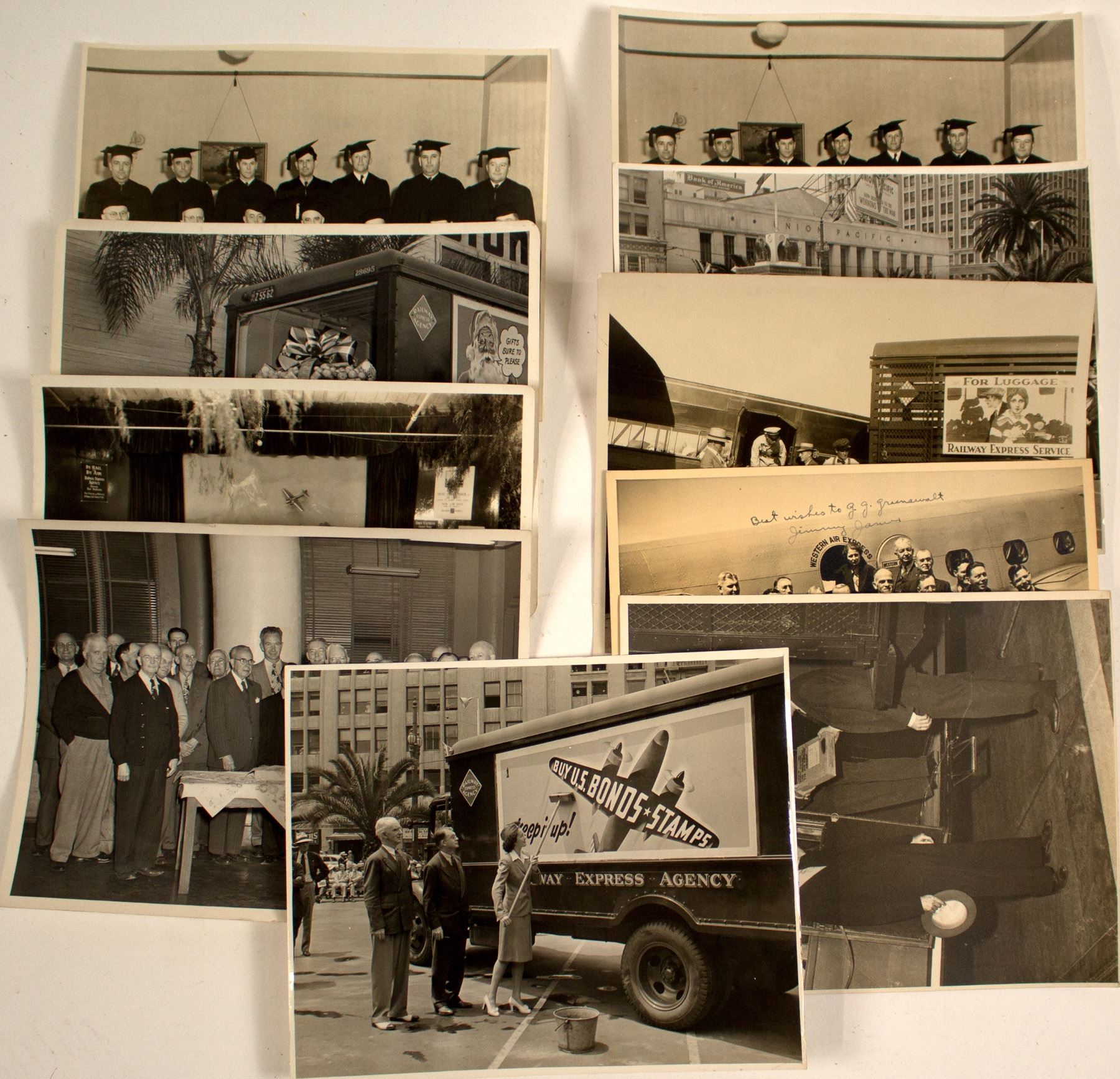 From the personal collection of George Garfield Greenawalt, express agent in Los Angeles from 1906 to 1951. Lot of ten. Includes two Western Air Express photos. One is a package being delivered and the other a group of men outside the Western Air Express. The later is signed by Jimmy James,the pilot who flew the first package for the company. It is addressed to G. G. Greenawalt. The former is probably a photo of him delivering that package. Three show different Railway Express Agency trucks. (George Garfield & Robert Greenawalt Railway Express and Wells Fargo Collection) State: City: HWAC#: 41721 Date: