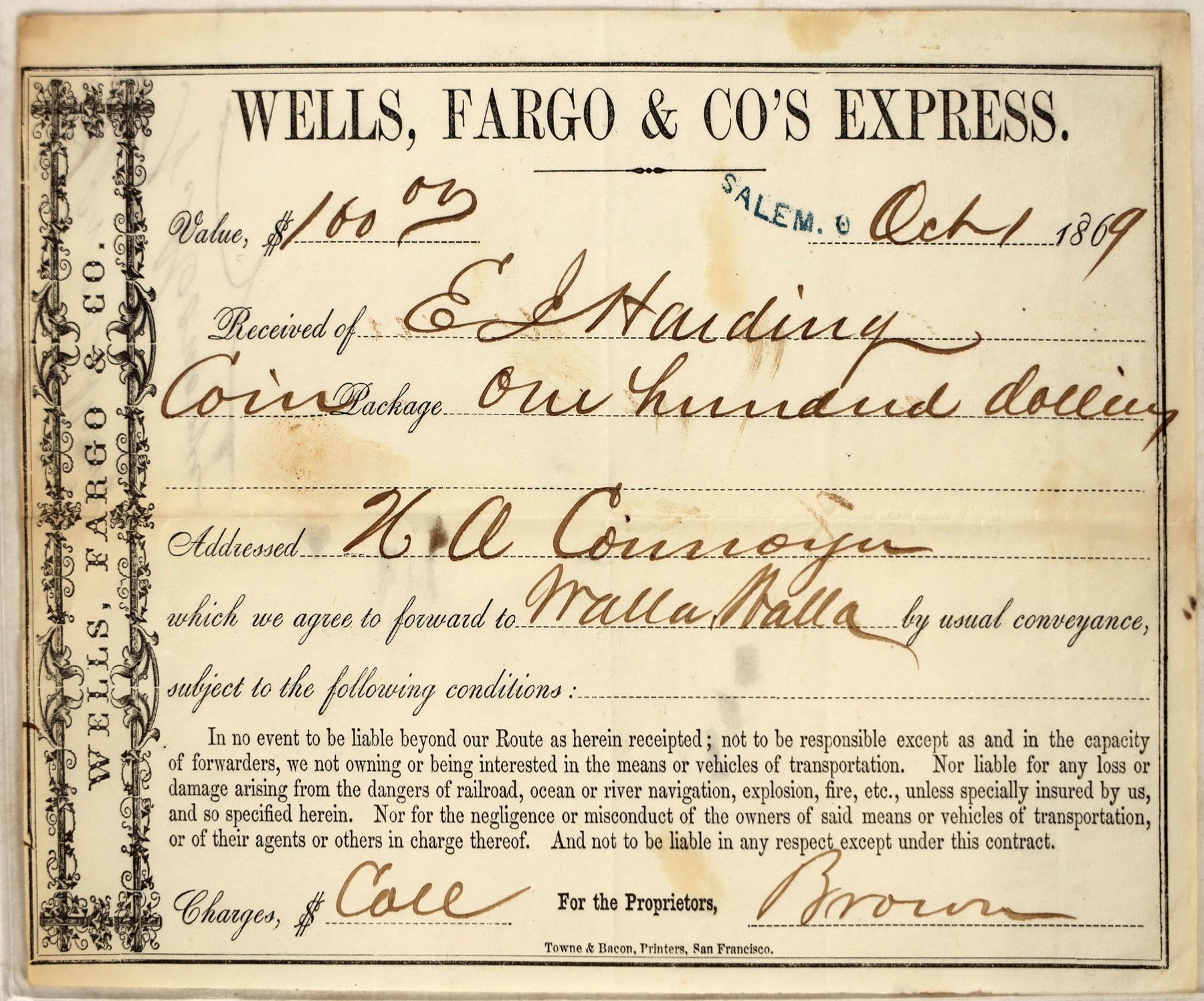Wells Fargo & Co's Express Salem, Ore. receipt for $100 in coin dated Oct 1869. Towne & Bacon printers. In protective sleeve and excellent cond.