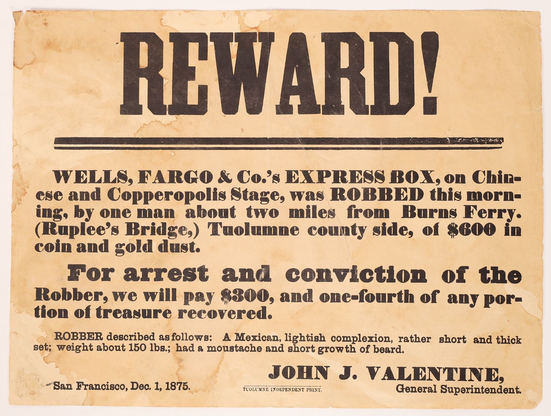 Dated San Francisco, Dec. 1, 1875. Wells Fargo & Co.'s express box on the Chinese and Copperopolis Stage was robbed by one man about two miles from Burns Ferry (Ruplee's Bridge) Tuolumne County side, of $600 in coin and gold dust. This reward poster from John J. Valentine, general superintendent of Wells Fargo, offers $300 and one fourth of treasure recovered. Although the robber was described as a Mexican, lightish complexion, rather short and thick set, weight about 150 lbs, with a moustache and short growth of beard, this was the area Black Bart was operating in at the time, before he became known as Black Bart. So this could be his robbery. Very little (next to nothing) is known of Black Bart's early stage robbing days. This area of the Mother lode was a nightmare for Wells, Fargo. The region carried some of the most productive gold mines in the state, and it was a stage robber's haven. Newspaper reports of a stage robbery a week were not uncommon. The area was "worked" by all the major stage robbers, from Black Bart to Bill Miner, the "gentleman robber." Did the two consort? One was a kind gentleman, the other a poet robber. Neither was a killer. Hume was unable to garner information on Black Bart until after his 1880 activities. Dillon's biography on Hume does not mention Miner, an interesting omission. 12 x 9 inches, some staining; edges very good condition. We were unable to find reports of this stage robbery in newspapers.com
