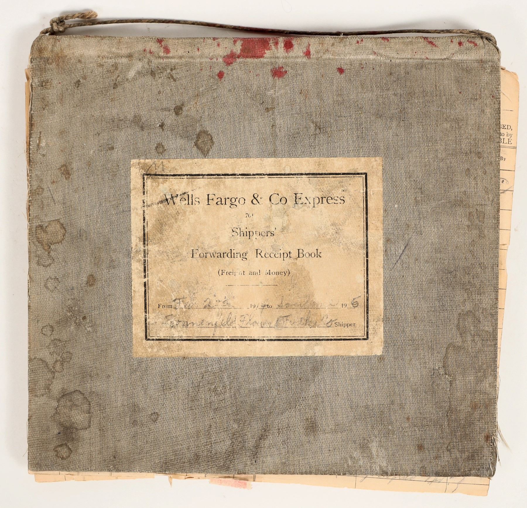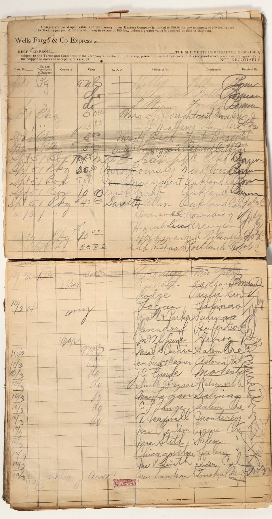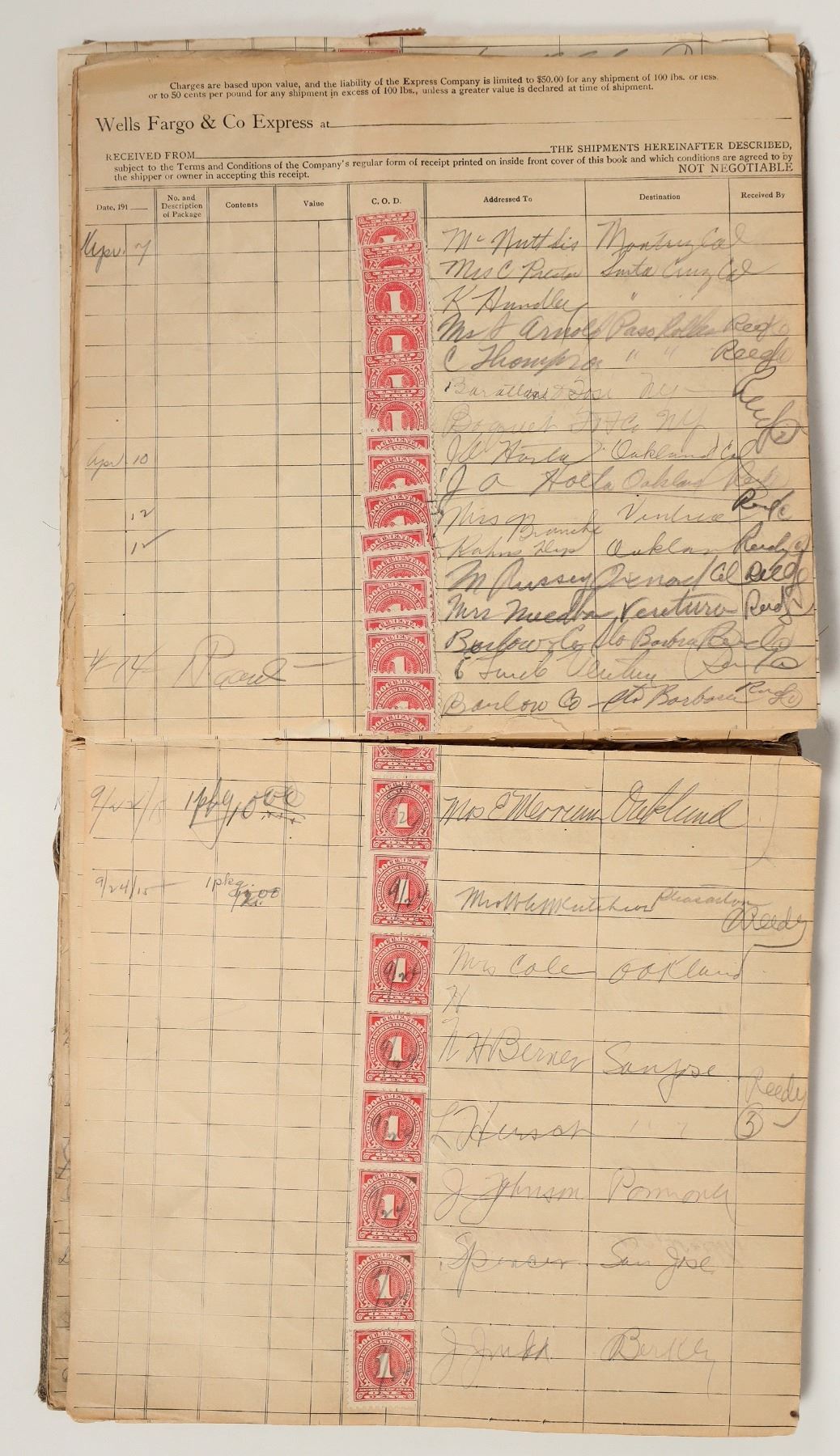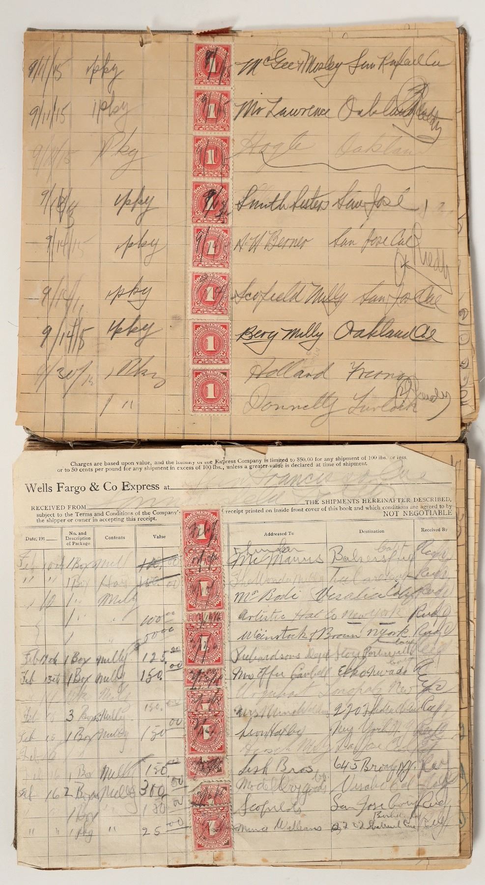 This Wells Fargo shipping receipt book is the first we have had with revenue stamps adhered inside on the pages. pages have a dozen or more 1 cent stamps attached. Perhaps 30 pages used. Shipments from San Francisco to all over California and including Goldfield, Nevada. 8.5 x 9" Some pages loose. Heavy toning and soiling. Please inspect.