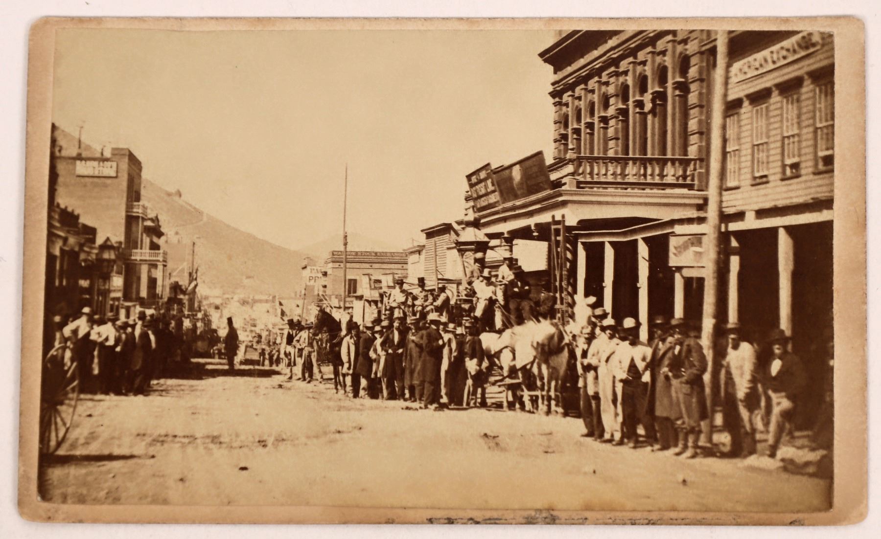 Fantastic view by Lawrence & Houseworth, 317 & 319 Montgomery St., San Francisco (identified on reverse). 710. "Pioneer Stages, leaving Wells, Fargo & Co's, C Street, Virginia City." One orange 2 cent bank check stamp with Oct. 10, 1865 date cancel. View shows many men in trench coats standing in C St. in front of the Wells Fargo office with stagecoaches lined up. Perhaps a big bullion shipment? Good contrast, medium focus, excellent content! An iconic view of a busy Virginia City, just a year after statehood. 2.5 x 4" Virginia City Nevada 1865