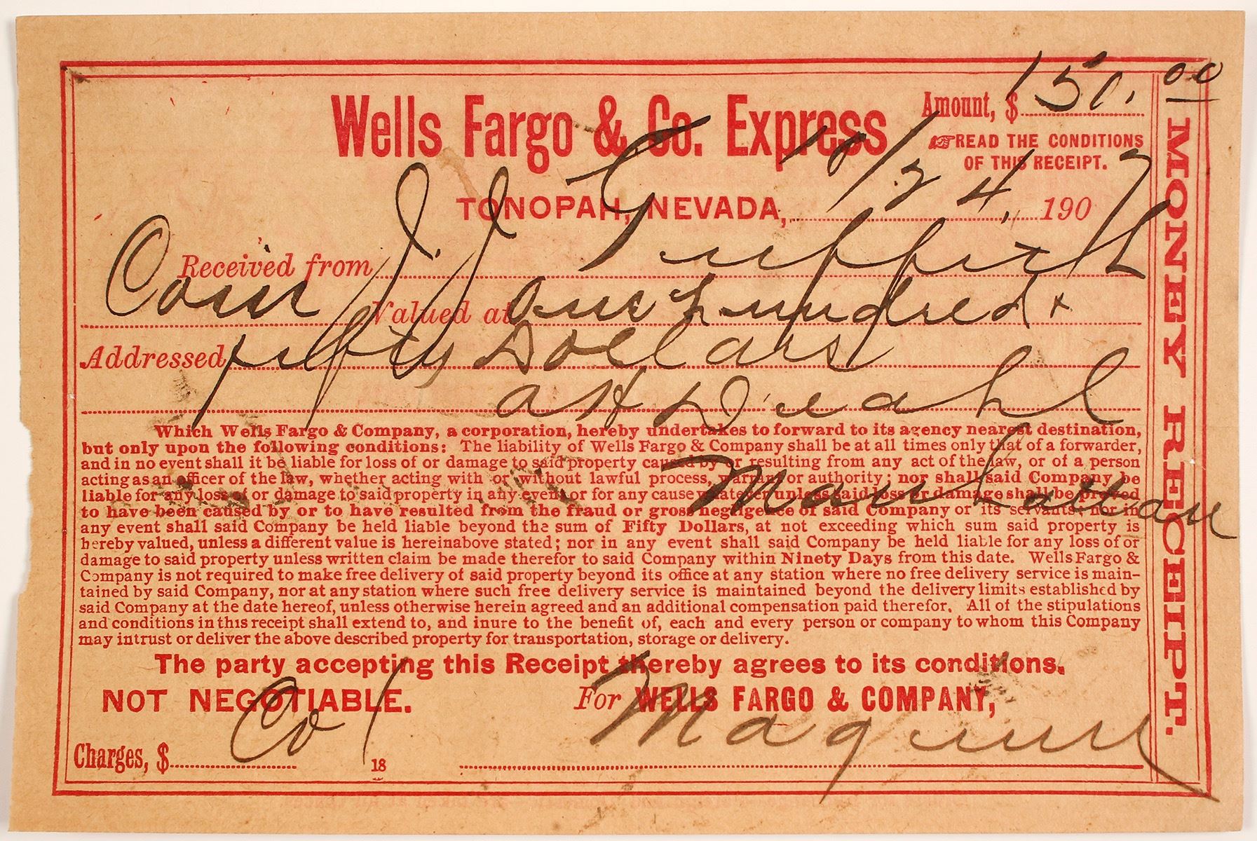 In the amount of $150, from Tonopah to Manhattan, rare usage for Wells Fargo. 7" x 4". Date: 1907 Location: Tonopah, Nevada HWAC# 63438