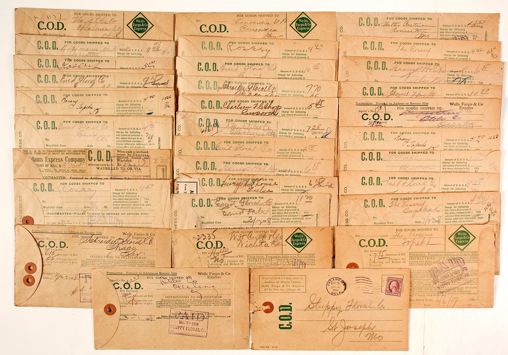 Over 40 envelopes, most addressed to Stupp Floral Company of St. Joseph Missouri from American Express, Wells Fargo, and Adams Express. Most postmarked from Oklahoma, Texas and Kansas. Date: Location: HWAC# 63607
