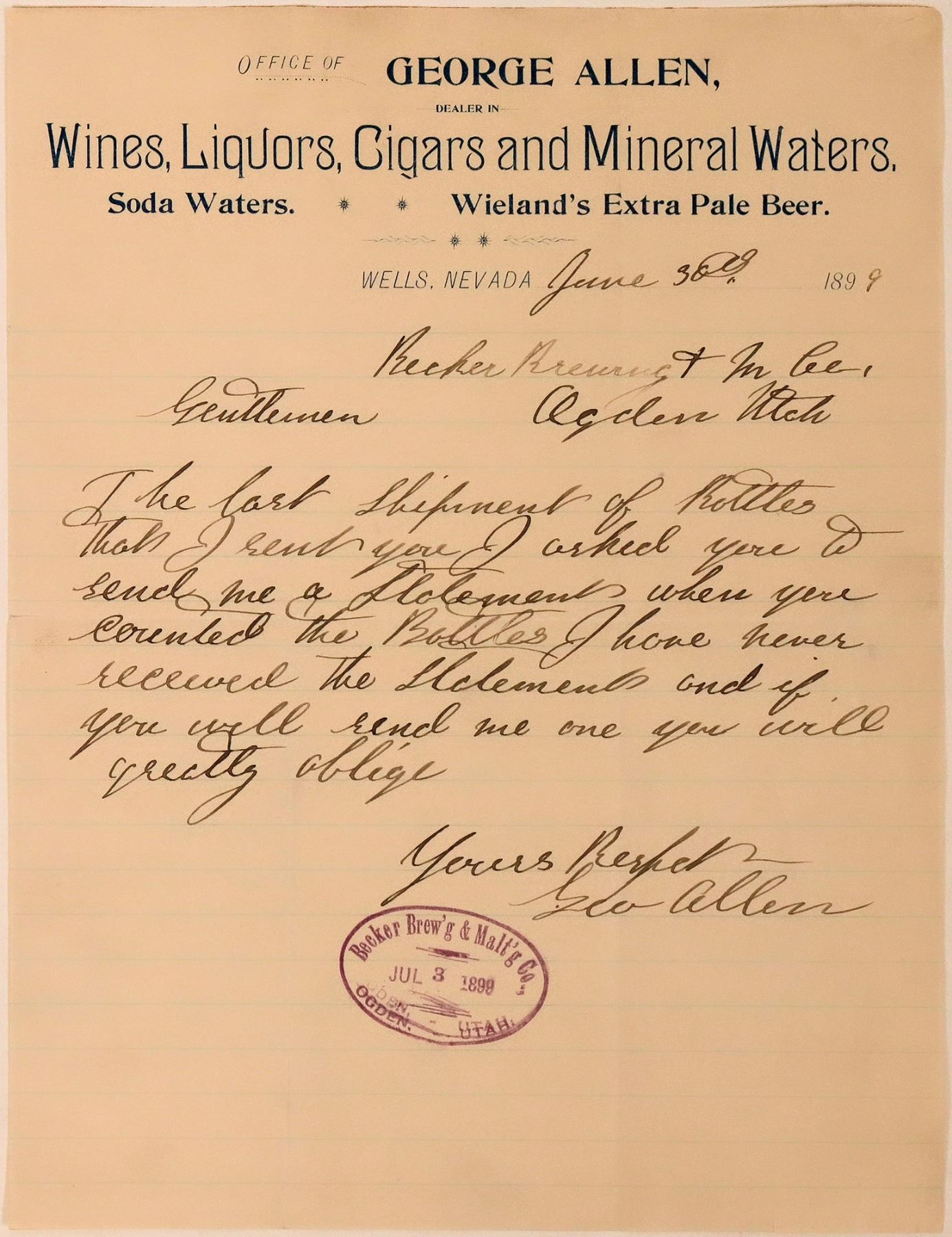Letterhead for George Allen, Dealer in Wines, Liquor, Cigars and Mineral Waters, Soda Waters, and Wieland's Extra Pale Beer. Dateline Wells, Nevada June 30th, 1899. Addressed to Becker Brewing & Malting Company in Odgen, Utah. Letter discusses a shipment of bottles sent by Allen. 8 x 10.5" Folds.