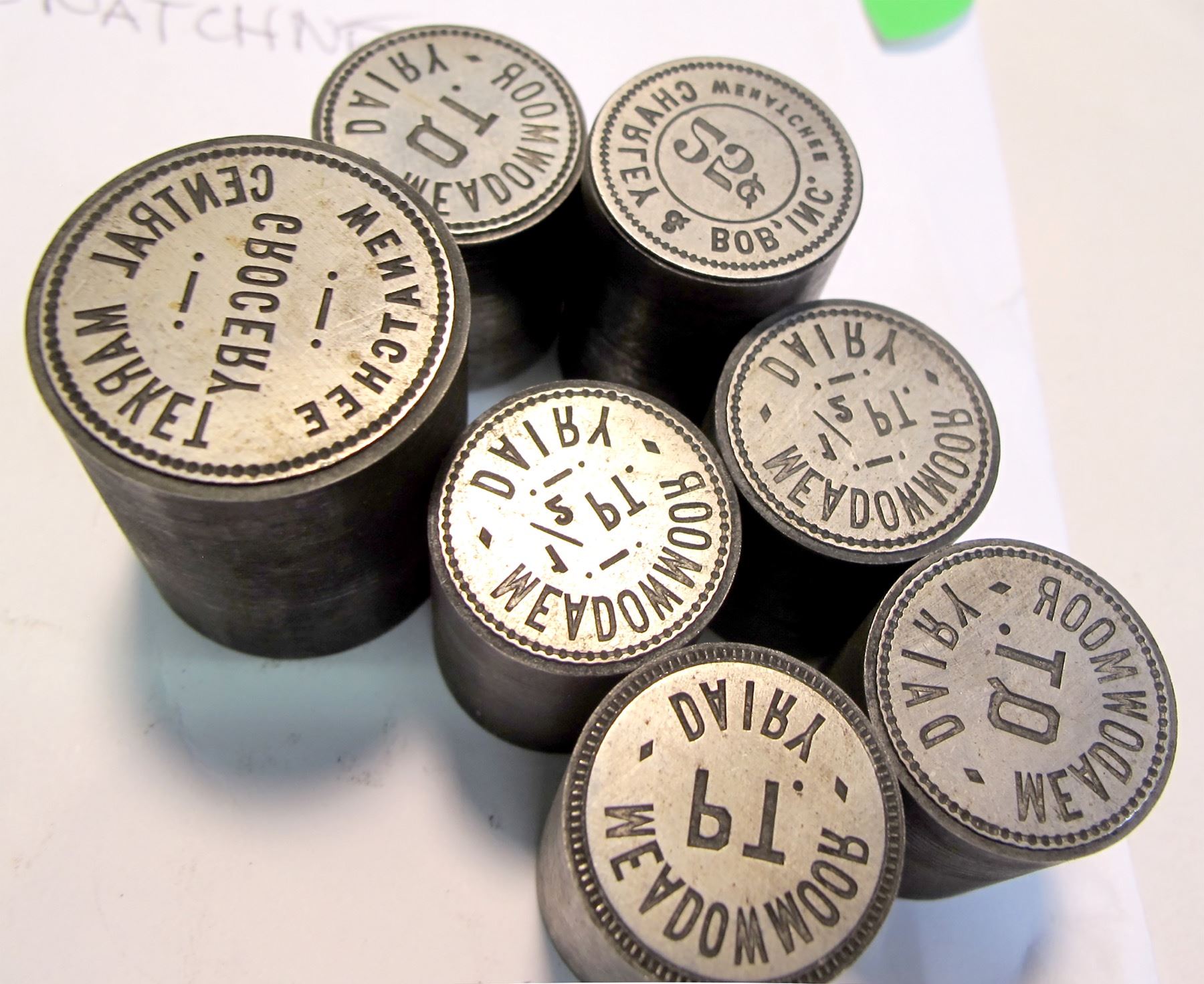 6 Token Dies self identified from Wenatchee, WA. 24mm: 5 Meadowood Dairy, Charley and Bob. 30mm: Central Market Grocery. Northwest Territorial Mint Historical Token Die Collection. State: Washington City: Wenatchee Date: c1903-1950 HWAC# 85020