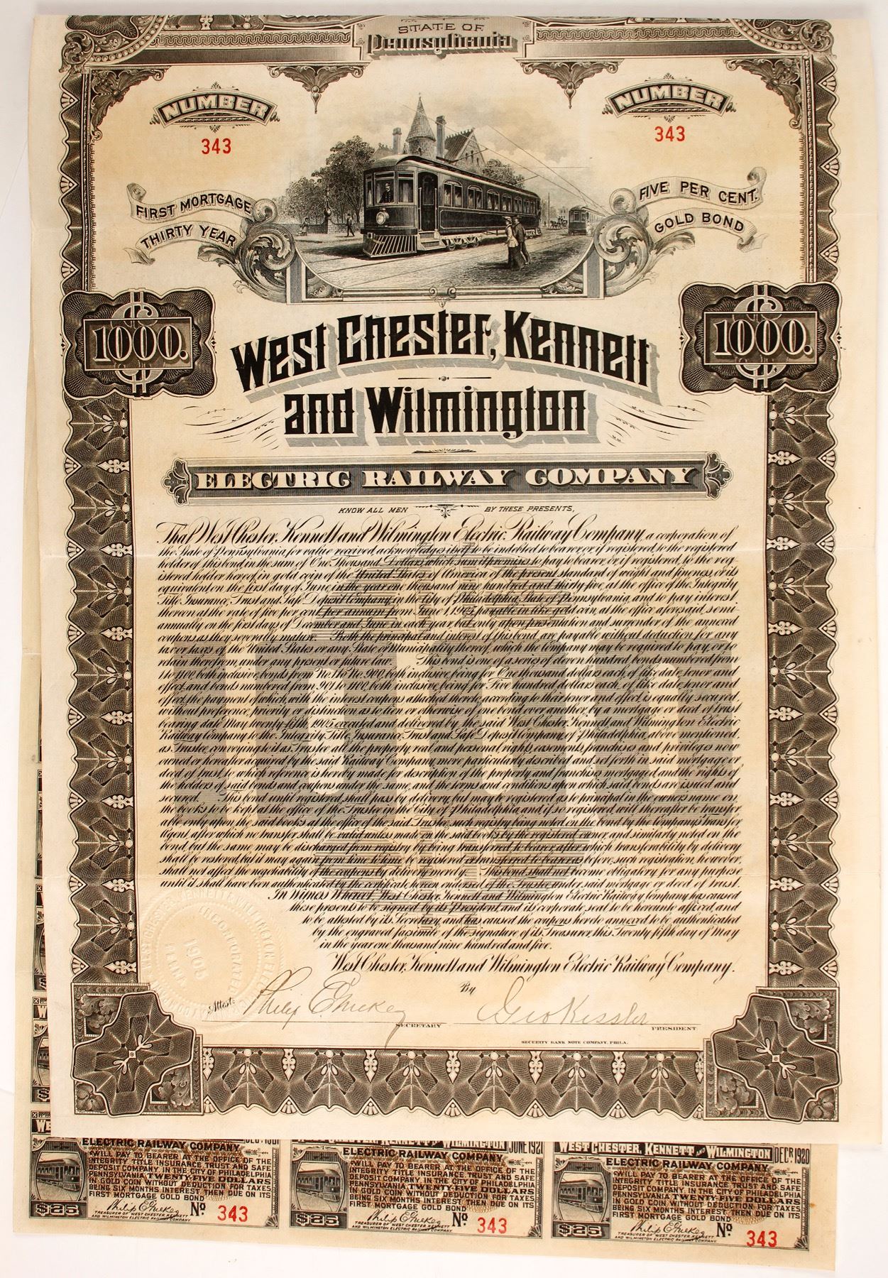 Incorp. 1905 State of Pennsylvania. I/U #343 First Mortgage, 5% , 30 yr, $1000 bearer bond. Issued May 25, 1905, signed Geo. Kissler president, dark gray, embossed seal, "$1000" over dollar sign gray underprint, vignette top couple walking to streetcar r-l, reverse street car l-r and deer, coupon attached, printer Security Bank note Co., condition AU State: Pennsylvania City: Date: