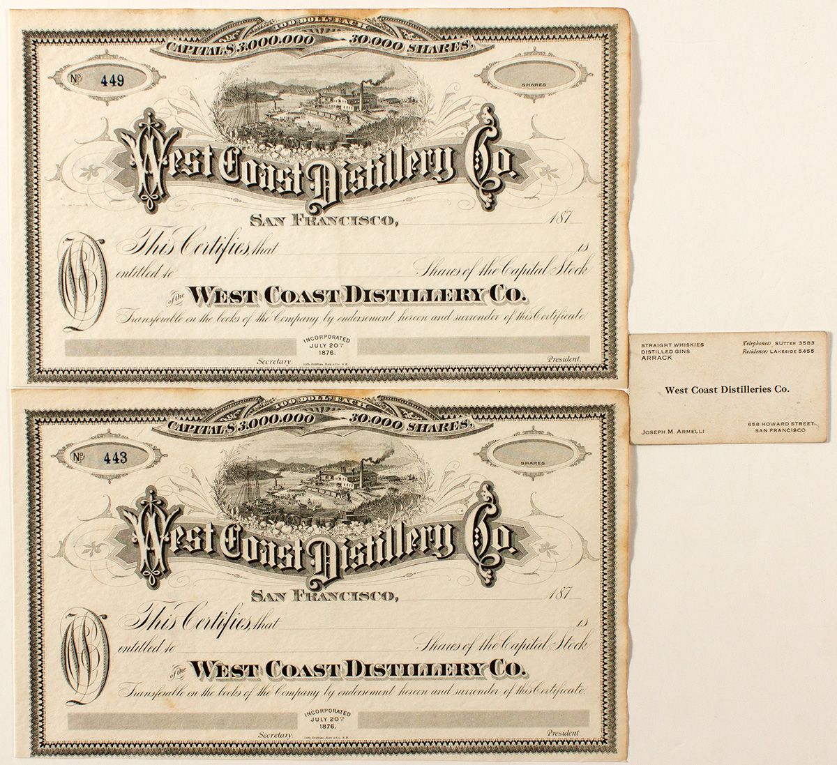 This is a lot of 3 pieces. 1) Business card for Joseph M. Armelli. 2) & 3) are unused stocks for the West Coast Distillery Co. They are stock no. 443 and 449, c1870. Both items have some wear including stains and writing.City: San FranciscoCounty: San Francisco CountyState: CADate: c1875