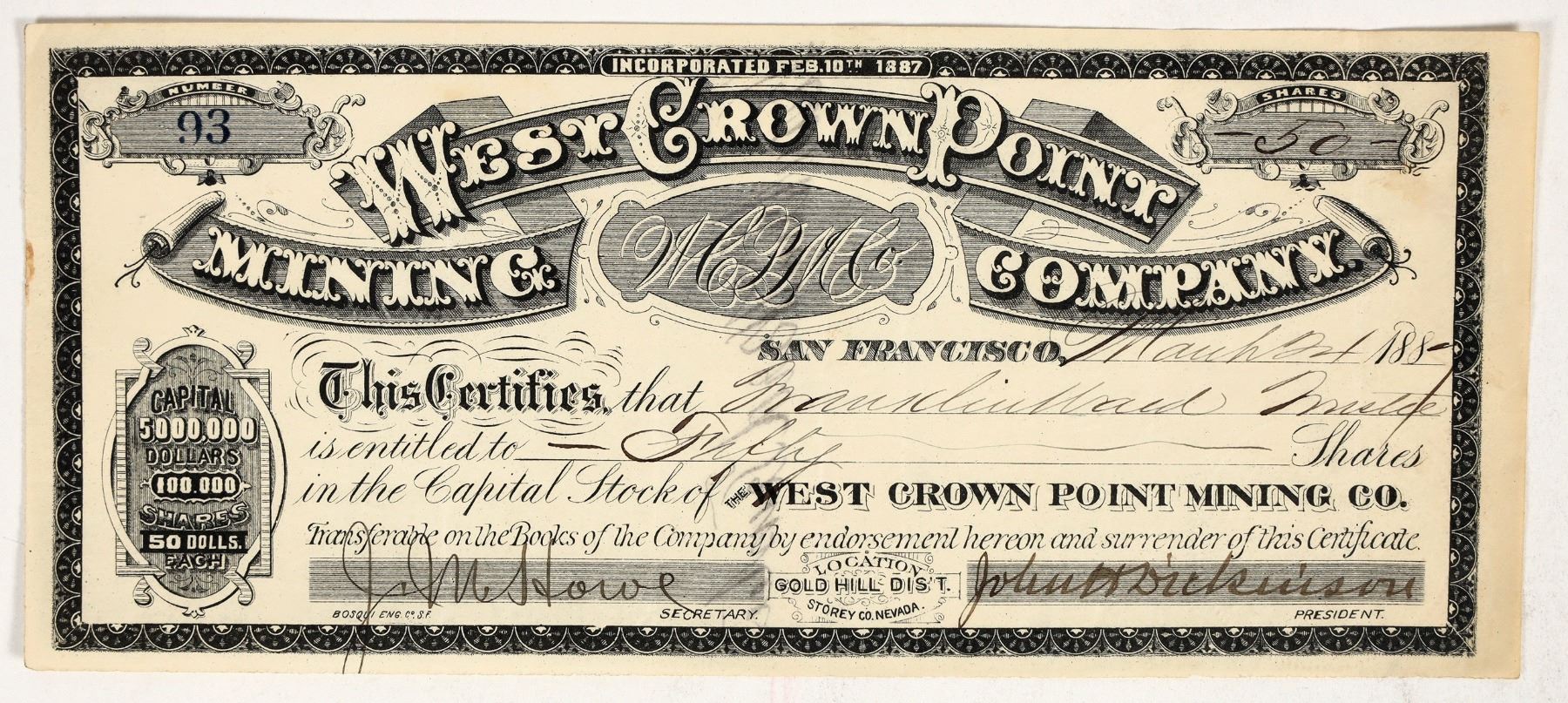 Very rare. "Location Gold Hill Dis't Storey Co. Nevada" (printed at bottom center). Inc. 1887. No. 93, issued for 50 shares to Franklin Ward in San Francisco in 1887. Signed by president John Dickinson and secretary Jm Howe. Not cancelled. Black border, ornate font. Bosqui Eng. Co. SF. 4 x 9.5" Folds, some soiling. The Crown Point (and neighbor Belcher Mine) were the site of a fantastic bonanza discovery in 1871. This company is likely a reincorporation for a portion of that property.