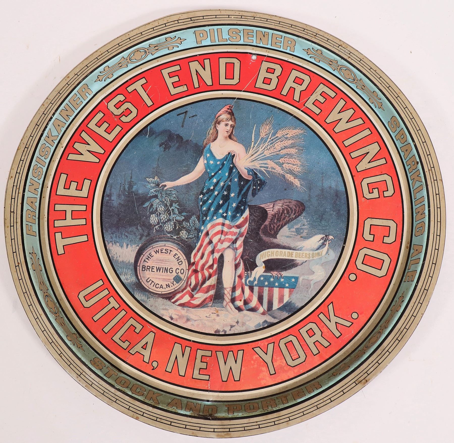 The beer tray was manufactured by "Barringer/ Wallis and Manners/ Mansfield/ England/ since 1890". The base is marked "The West End Brewing Co./ Utica, New York"/ and on the inside edge: "Fransiskaner/ Sparkling Ale/ Stock and Porter". The base depicts lady liberty making beer. The tray is 13.25 in. across, severely dented, a hole drilled top center, fair condition. Utica New York