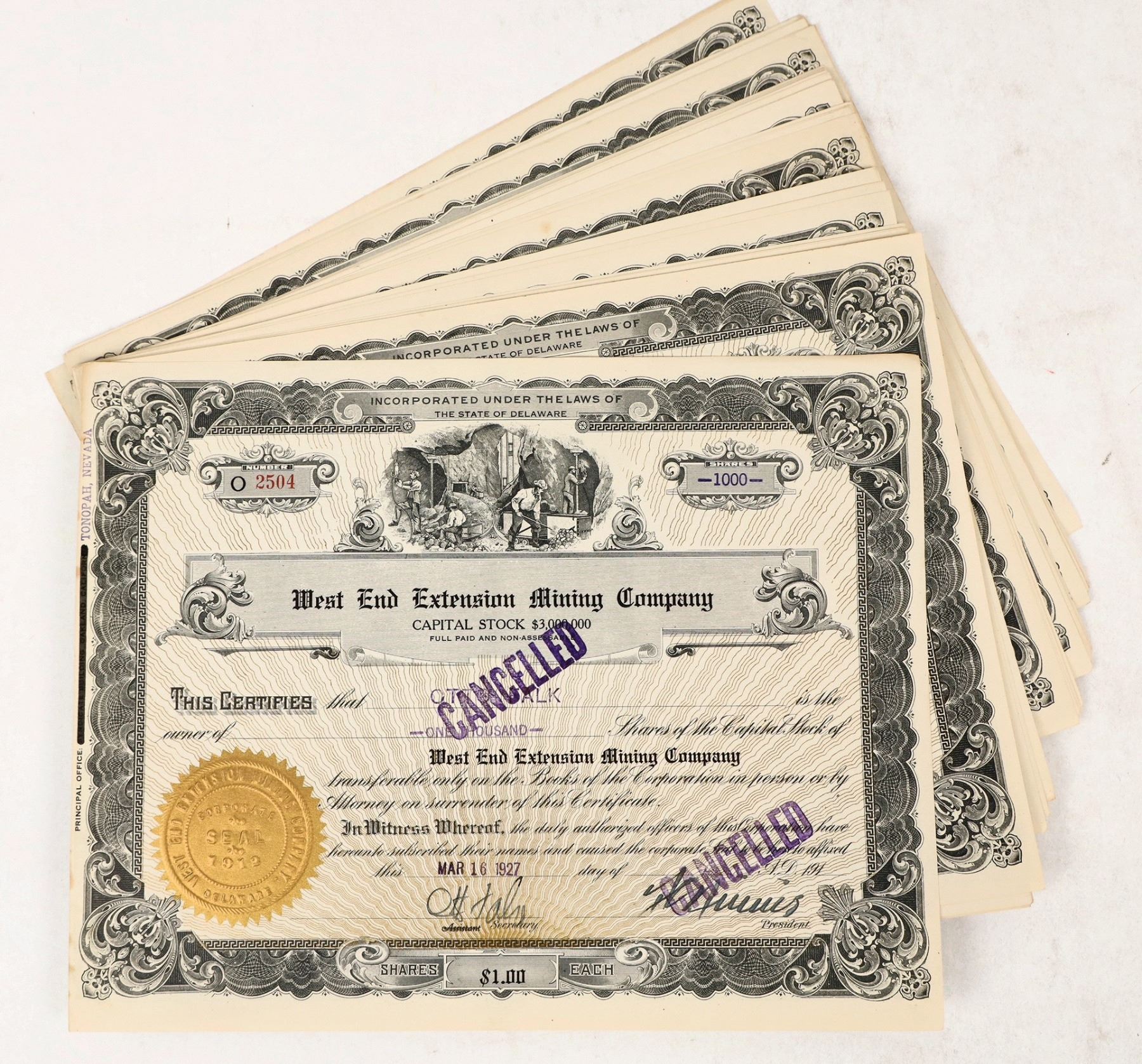Group of approx. 45 stock certificates from the West End Extension Mining Company of Tonopah, Nevada, all dated 1927. All issued w/ signatures of secretary and president + gilt seal, all cancelled. Excellent vignette of a mining scene. All in excellent condition; see photos.