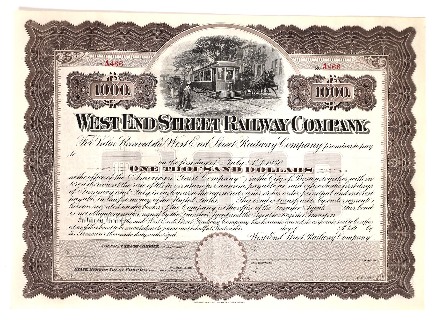 U/I West End Street Railway bond, 4.5% $1000. Massachusetts Ken Prag Collection