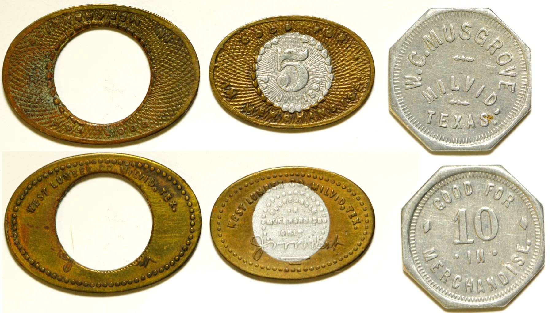 Lot of three: two from West Lumber Company, one bimetallic, GF 5c, oval. The other GF 10c, missing center. Also W.C. Musgrove / Milvid / Texas; Rev.: Good For / 10 / In / Merchandise. Al., octagonal, 22 mm. State: Texas City: Milvid Date: HWAC# 82461