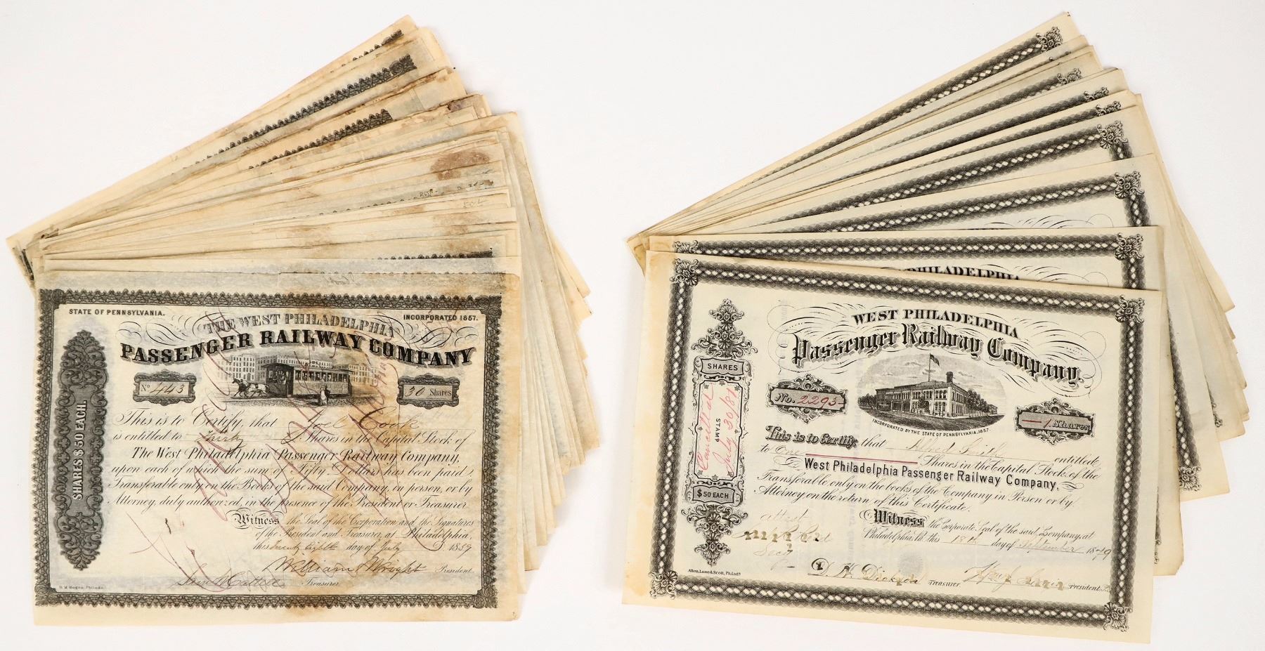West Philadelphia Passenger Railway Company, incorporated 1857, state of Pennsylvania, issue dates 1859-1879, many cancelled, very few are not. Treasurer, D.W. Dickson; President Wm. J Swain. Two styles: 9.75 x 7.125 in. ~60 pcs; 11 x 7.25 in ~14 pcs.