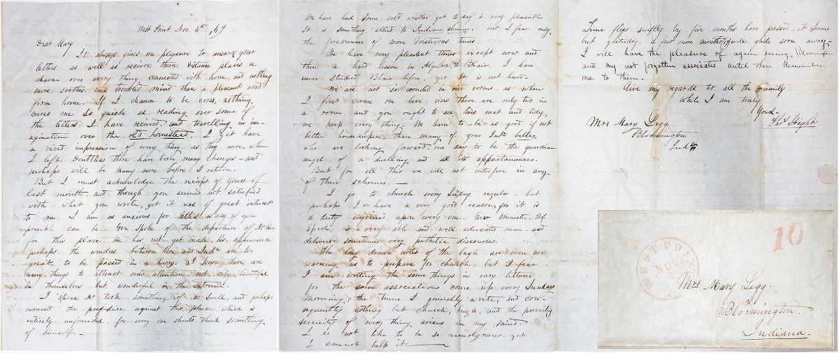 Personal letter (dated Nov. 4, 1849) from Thomas Hight from West Point to Mary Legg (probably a family member). In the letter he talks about how much pleasure he gets from receiving letters from home. He re-reads letters he has saved and says he gets a vivid impression of things as they were when he left. He says he expects things to be changed by the time he returns home to Indiana. He is expecting someone he knows to show up who hasn't yet, but suspects he is sight-seeing along the way from indiana to New York. He speaks of lessons in algebra, his room situation which has gotten better and how neat he is being. he worries he is boring her with the same things again and again, but says he cannot help it. He has been at West Point for five months and has 19 more to go. The letter is on a lined and folded sheet and takes up a bit more than two pages.