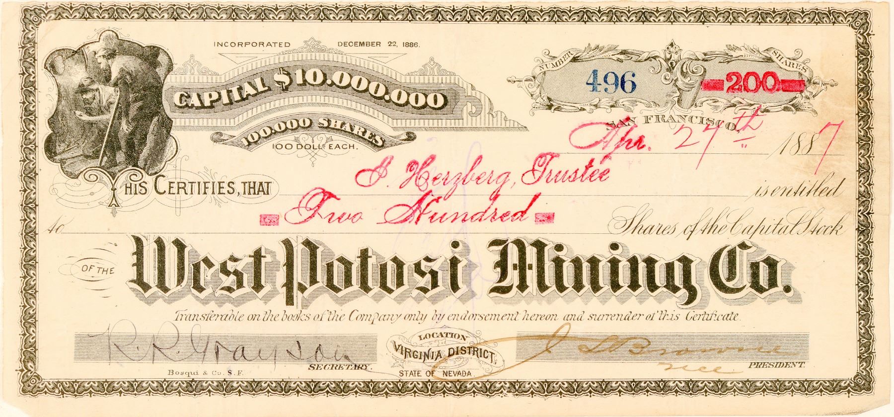 Location: Virginia District, State of Nevada (printed bottom center). Inc. Dec. 22, 1886. No. 496, issued for 200 shares to I. Herzberg on Apr. 27th, 1887. Signed by vice-president J. Browne and secretary R.R. Grayson. Not cancelled. Vignette at upper left of two miners inspecting a piece of ore. Printed by Bosqui & Co., SF. Pinholes, folds, nicked corner, some staining. 4.25 x 9" The Potosi Mine was located in 1860 and was located in Virginia City adjacent to the Chollar and Hale & Norcross mines. Litigation in the 1860s forced the Chollar and Potosi to merge. They split apart again in the late 1870s. () Ken Prag Collection