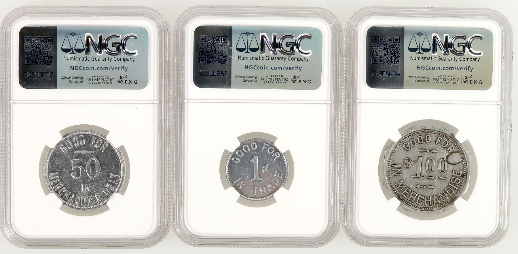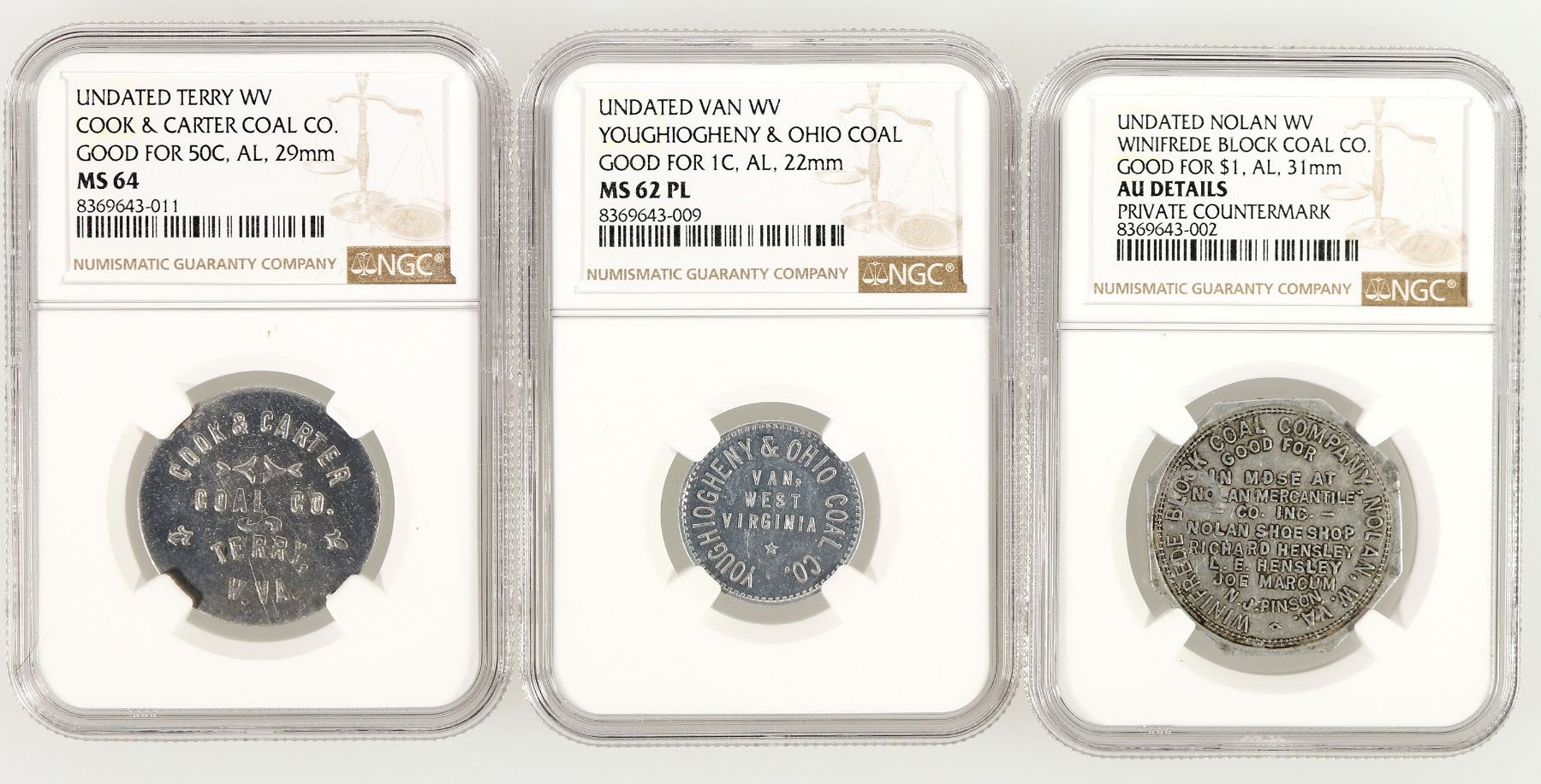 Three NGC graded West Virginia Coal Company tokens: 1) MS 62 PL: YOUGHIOGHENY & OHIO COAL CO. / VAN, / WEST / VIRGINIA // GOOD FOR / 1c / IN TRADE; Al., rd., 22 mm. 2) MS 64: COOK & CARTER / COAL CO. / TERRY, / W. VA. // GOOD FOR / 50 / IN / MERCHANDISE ONLY; Al., rd., 29 mm. 3) AU Details: private countermark: