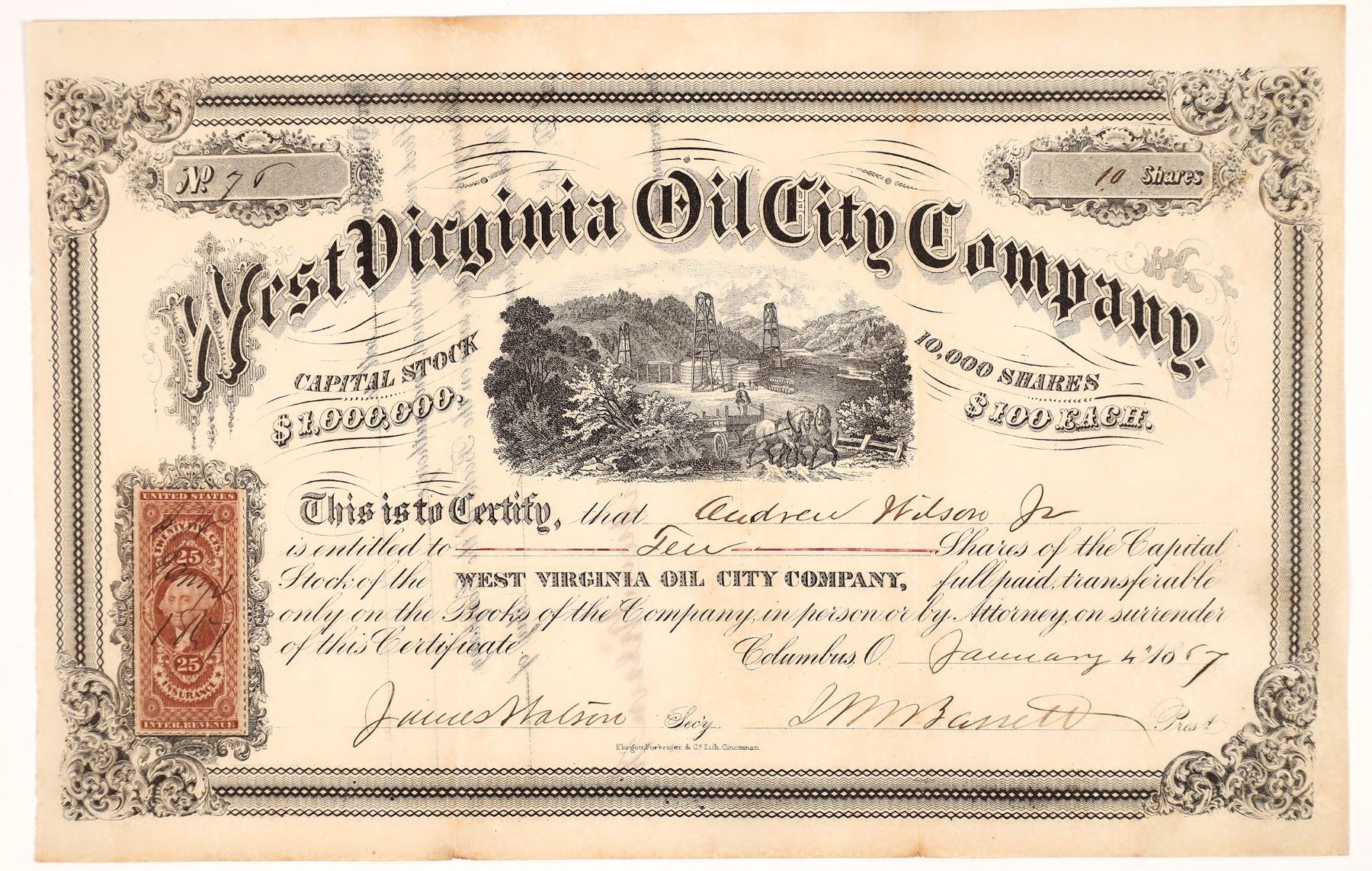 No. 75, issued for 20 shares to Andrew Wilson Jr. in Columbus, Ohio, 1867. Signed by president Barnett and secretary James Watson. Not cancelled. Vignette of wagon moving away from oil derricks and tanks. Printed by Ehrgott, Forbriger & Co., Cincinnati. 25 cent US IR Life Insurance stamp attached at lower left. 6.5 x 10" Folds, some toning. Formed to extract oil in Kanawha Valley fields, West Virginia (Urbana Union, 07 Nov 1866).