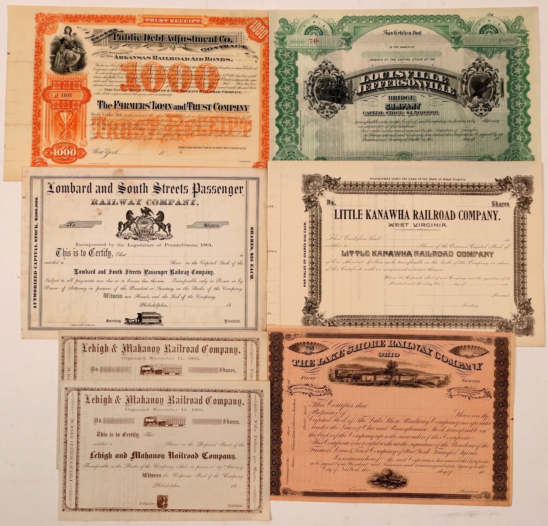 Seven Unissued/Uncanceled stocks. 1. Arkansas Railroad Aid Bond, orange, for The Little Rock, Pine Bluff & New Orleans Railroad Co. #1103, $1000 Trust Receipt (orange underprint, dateline 18__, vignette top left allegorical female sitting w/basket of flowers. American Bank Note Co. printer. EF 2. The Lake Shore Railway Co., #856, dateline 18__, black/red underprint, vignette 4-4-0 w/cars r-l. American Bank Note Co. printer. 3. Two Lehigh & Mahanon Railroad Co., brown, not numbered, dateline 18__, vignette 4-4-0 r-l , small bear at bottom. 4. Little Kanawha Railroad Co, not numbered, dateline 189_, black, no vignette, receipt attached, printer unidentified. 5 Lombard and South Streets Passenger Railway Co., not numbered, dateline 18__black. Vignette bottom horse drawn trolley, top state seal.Edward Stern & Co. printer. 6. Louisville and Jeffersonville Bridge Co., #748, dateline 19__, green, vignette left 4-4-0 r-l eagle w/wings spread. New York Bank Note Co printer.