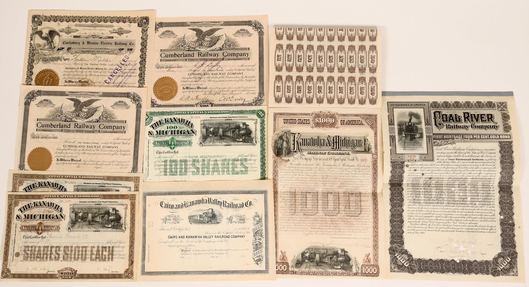 1. The Kanawha & Michigan Railway Co.- 1. #1938, I/C, $1000, 4%, Gold bearer bond due 1990, issued June 3, 1890. Signed by president, brown, embossed seal, vignette bottom two trains @ depot, top left Indian female, top right cherub. 1000 brown underprint over sunburst, coupons 162-200 attached female vignette. American Bank Note Co. printer. EF-AU condition. 2. Three stock certificates, shares $100 par, vignette top left two trains @depot, lady liberty in company logo, American Bank Note Co printer. #2334, U/U, green, signed president and secretary, "100 Shares " green underprint. #A1268, U/U , brown, signed president and secretary, "SHARES $100 EACH" brown underprint. #A117, I/C, 50 shares issued Aug 8, 1890 signed R.M. Kelly president, brown, "SHARES $100 EACH" brown underprint. 25c revenue stamp on reverse. VF- AU. 2. Cumberland Railway Co Stock Certificate - Cert. #2, issued for 1 share in 1902 to C.W. Dailey and signed by Dailey as president. C.M. Hendley signs as secretary. Eagle with flag vignette. Shares were $100 Each. 3. 4 stocks and bonds from West Virginia rails. 1) Clarksburg & Weston Electric Railway Co. stock, 1 share, 1912. Hole and stamp cxled. 2) Coal River Railway Company, 1905, due 1945, 1st Mtg. gold bond, $1,000, 4%. Train in frame at top left. Hole punch cxled. 3) Cumberland Railway Co., U/I, 190X. Eagle with flag. 4) Cairo & Kanawha Valley Railroad Company, train at top left to right, 189X.