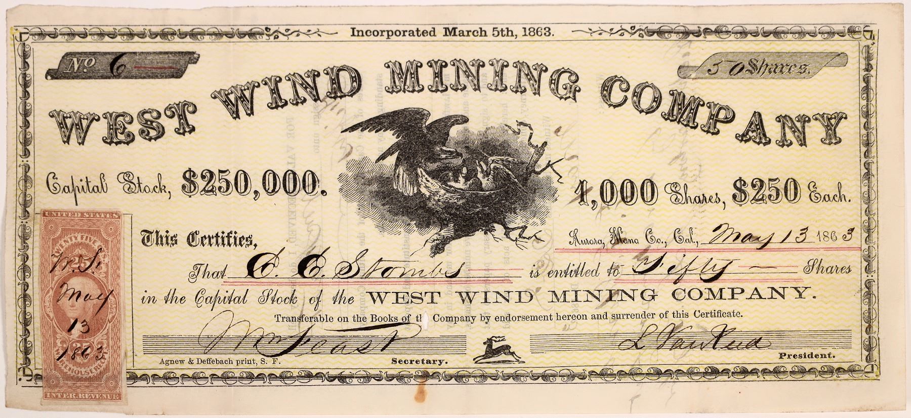 One stock cert issued by West Wind Mining Company of Aurora, Mono County, California dated 1863. Cert #6, 50 shares @$250 each, signed by Secretary William Feast and President L Vautua (sp?). Printed by Agnew and Deffebach/San Francisco. 25c Warehouse Recp't Revenue Stamp. Not cancelled. Vignette of eagle feeding young. Note: Aurora - now a ghost town - is one of Nevada's legendary 19th century mining settlements, even attracting aspiring prospector Samuel Clemens who eventually turned to writing under the pseudonym Mark Twain. Aurora sprang to life in 1863 with the discovery of the Wild West Vein, going on to yield $27 million in gold for the next year or two until the town was essentially shuttered in 1870. Aurora was the county seat of both Mono County, CA and Esmeralda County, NV in its heyday and eventually was officially declared a Nevada townsite in a future resurveying. Additional Note: Cory & Hicks staked the first claims in the Aurora Mining District on Silver Hill on August 24, 1860. The first shipment of ore was made on November 10, 1860. Shortly thereafter the Esmeralda Mining Company and the Consolidated Silver Hill Mining companies were formed and incorporated. William Feast was in Aurora by 1861. He owned a cabin on the northeast corner of Silver & Del Monte. He was the Mono County Treasurer and continued in this capacity after Aurora was proven to be in Nevada. Feast was the secretary of the West Wind, Fairy Queen, Utah, Gibraltar etc. He died in Aurora in 1864. (Additional Note from Prag Collection.)