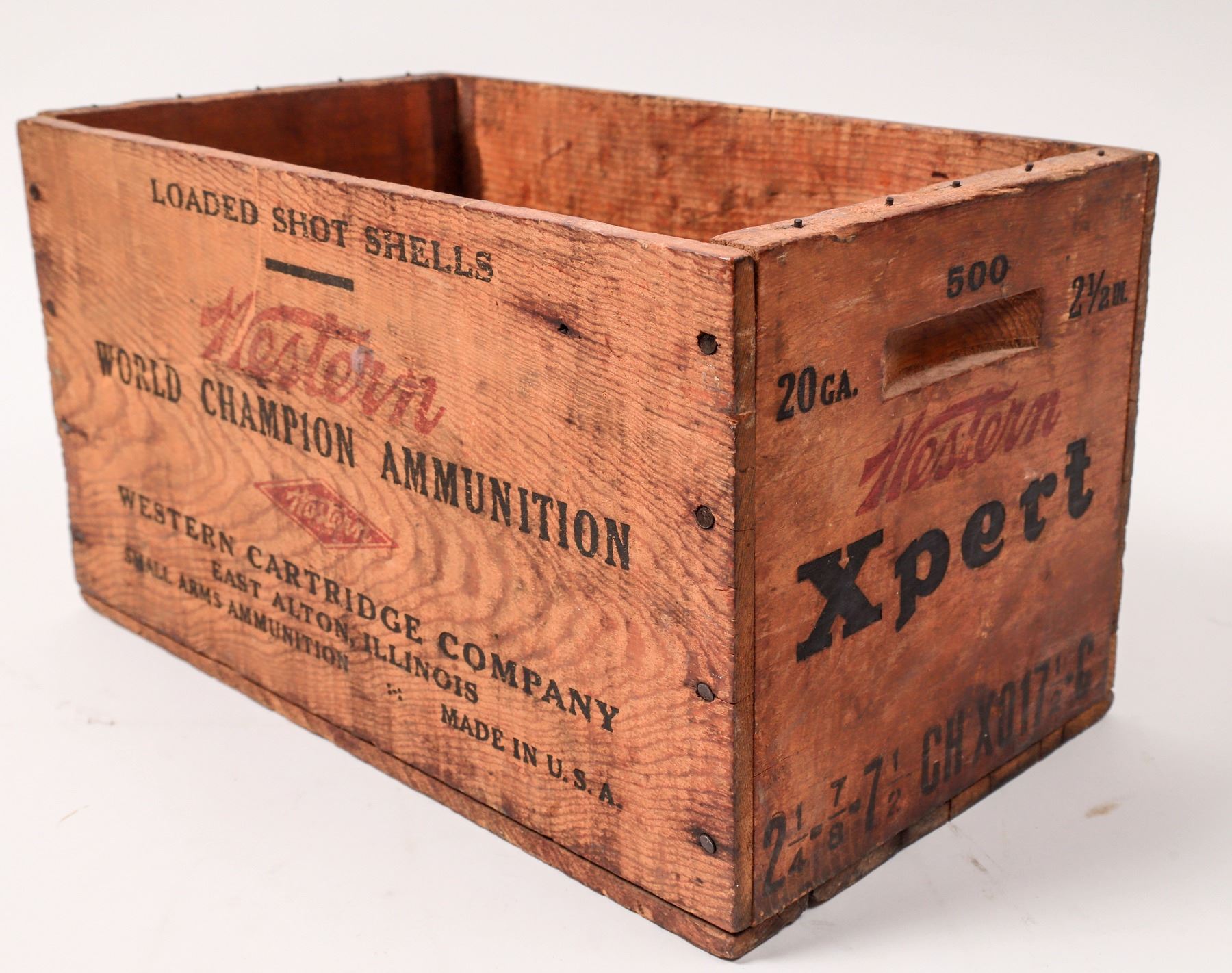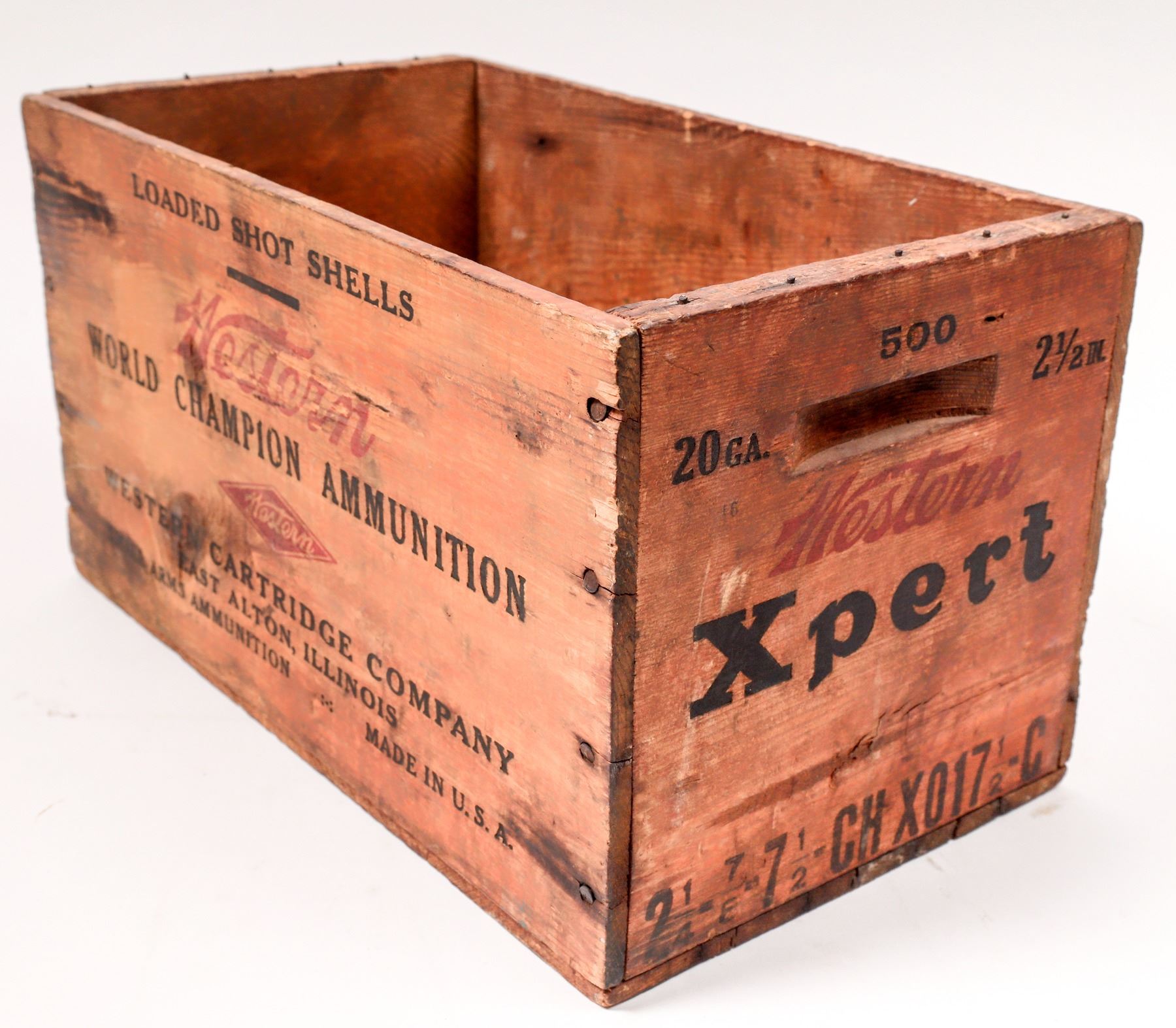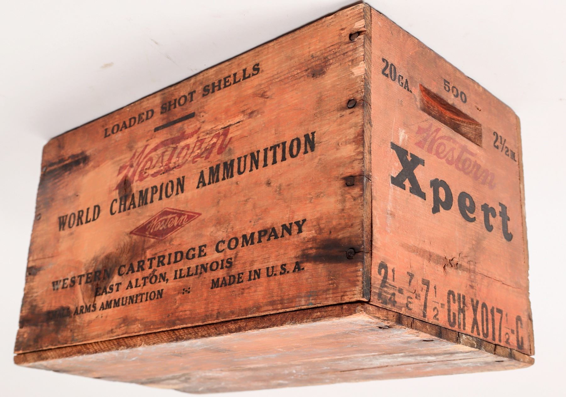 This lot holds a vintage Western ammunition box marked 500 rounds, 20 ga. 2 1/2 in. Western Xpert loaded shotgun shells, 14 in. X 8 in. X 8 in. A vintage wood shotgun cleaning rod is included with pressed brass ferules lightly used. C. 1940's.