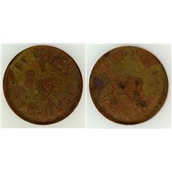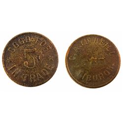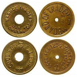 1) Board of Trade / / GF 12-1/2c / At Baylor / Or Glasgow. Round, brass, 20mm, center hole. 2) Washoe Trading Co. / Bar Check // GF 5c at Bar. round,